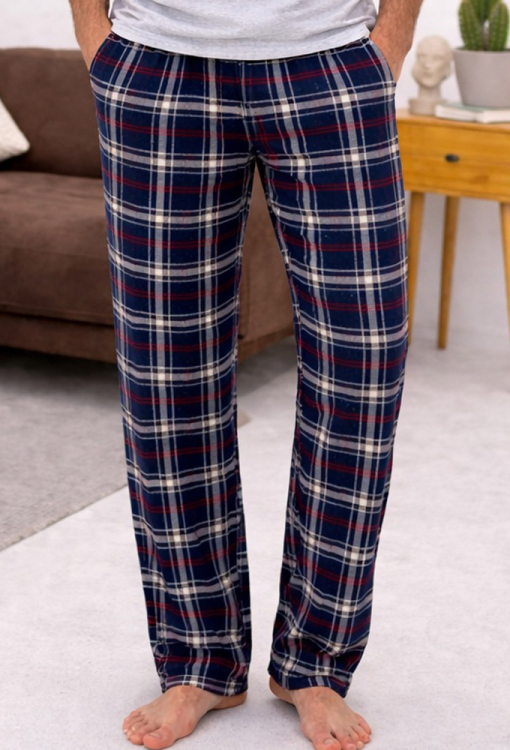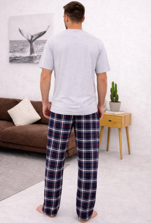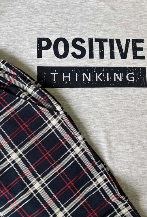 Стильна чоловіча піжама Positive Thinking від українського бренду Cosy. Піжама виконана з якісної та м'якої бавовни, складається з футболки сірого кольору та темно-синіх штанів у сірий картатий принт з червоними акцентами. Футболка прямого силуету, з короткими рукавами та круглим вирізом горла, на рівні грудей прикрашена принтом із напису "Positive Thinking". Штани також прямого крою, з м'якою гумкою в поясі та зручними бічними кишенями. Піжама дуже красива і приємна до тіла, ідеальна для сну та домашнього відпочинку, а також може бути чудовим подарунком коханій та близькій людині.