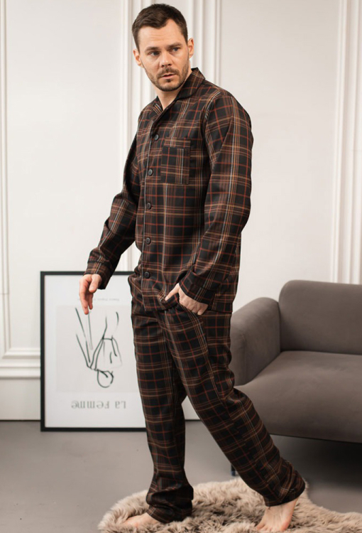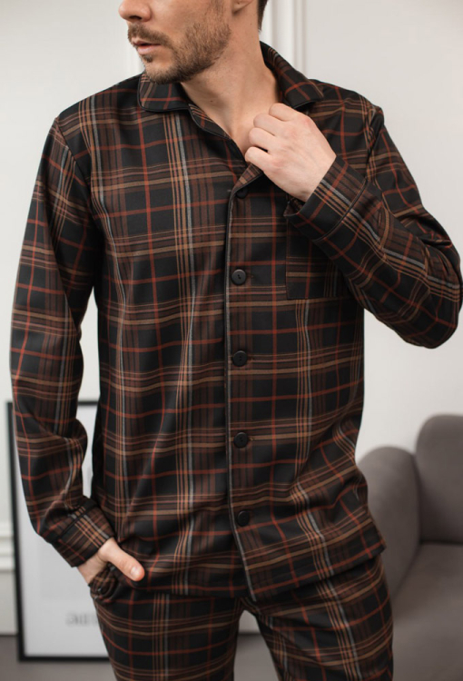 Тепла чоловіча піжама від українського бренду BO.Brand. Піжама виконана з м'якої і якісної фланелі з начосом, коричневого кольору в чорний картатий принт, складається з сорочки та штанів прямого силуету Сорочка з довгими рукавами, відкладним коміром і накладною кишенею на грудях, застібається ґудзиками. Комір, полиці, рукави та кишеня моделі прикрашені тонким кантом чорного кольору. Штани з м'якою гумкою в поясі та зручними бічними кишенями, внизу оброблені чорним кантом. Піжама дуже красива і приємна до тіла, ідеальна для сну та відпочинку в холодну пору, а також може бути чудовим подарунком коханій або близькій людині.