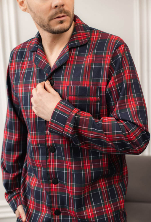 Тепла чоловіча піжама від українського бренду BO.Brand. Піжама виконана з м'якої і якісної фланелі з начосом, червоного кольору в зелений картатий принт, складається з сорочки та штанів прямого силуету Сорочка з довгими рукавами, відкладним коміром і накладною кишенею на грудях, застібається ґудзиками. Комір, полиці, рукави та кишеня моделі прикрашені тонким кантом чорного кольору. Штани з м'якою гумкою в поясі та зручними бічними кишенями, внизу оброблені чорним кантом. Піжама дуже красива і приємна до тіла, ідеальна для сну та відпочинку в холодну пору, а також може бути чудовим подарунком коханій або близькій людині.