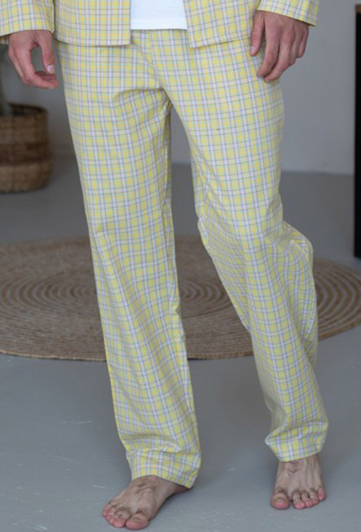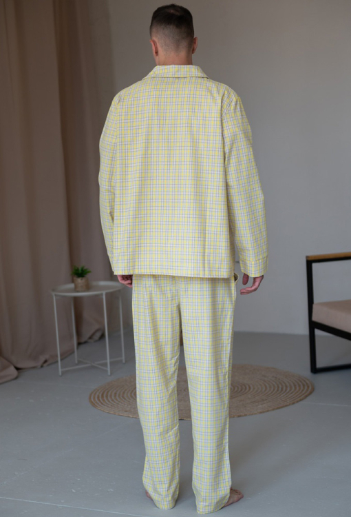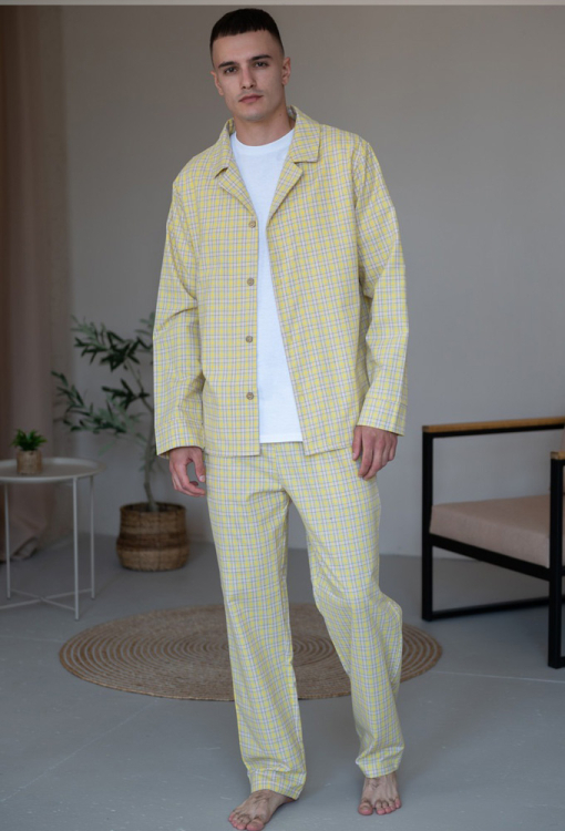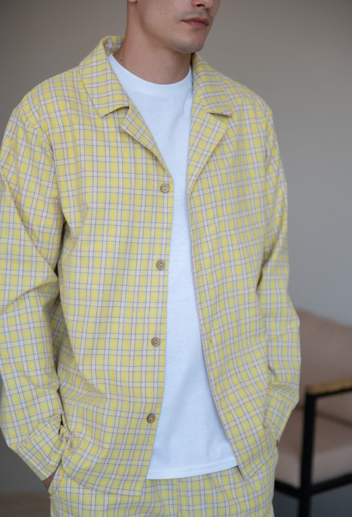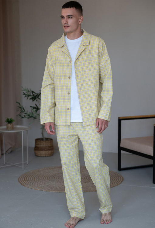 Зручна чоловіча піжама комплект від українського бренду LoomLine. Комплект виконаний з якісного і м'якого матеріалу, складається з фланелевої сорочки зі штанами жовтого кольору в блакитний картатий принт і білої бавовняної футболки. Сорочка прямого крою, з довгими рукавами та відкладним коміром, застібається на ґудзики, рукави оброблені вільними манжетами. Штани з м'якою гумкою в поясі та зручними бічними кишенями. Футболка прямого силуету, з круглим вирізом горла та короткими рукавами, на грудях праворуч прикрашена кишенею жовтого кольору в клітинку. Комплект дуже красивий і комфортний, ідеальний для сну та домашнього затишку, а також може бути чудовим подарунком коханій та близькій людині.