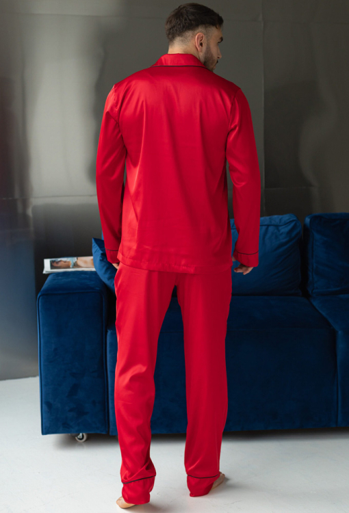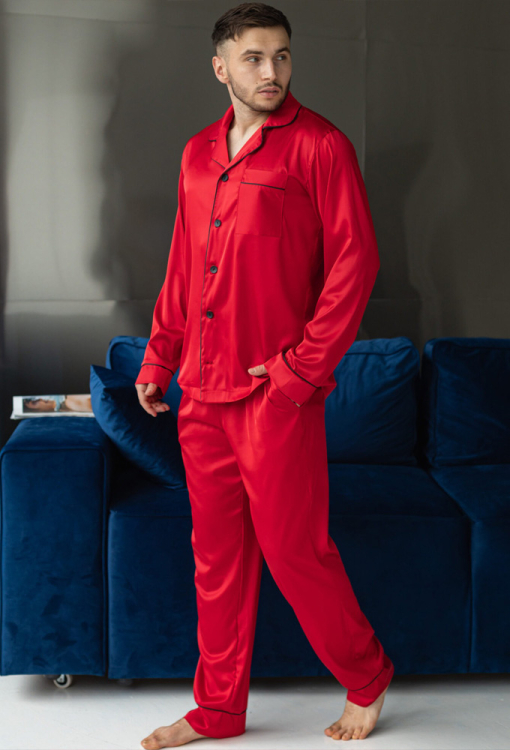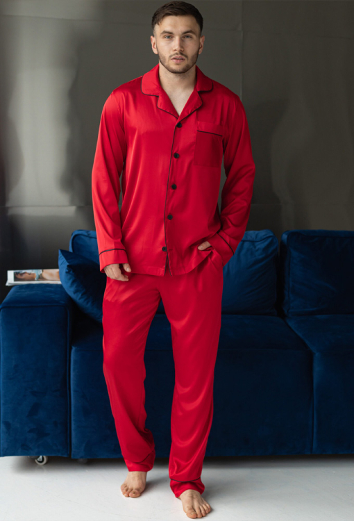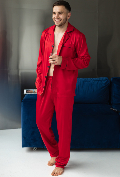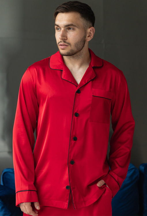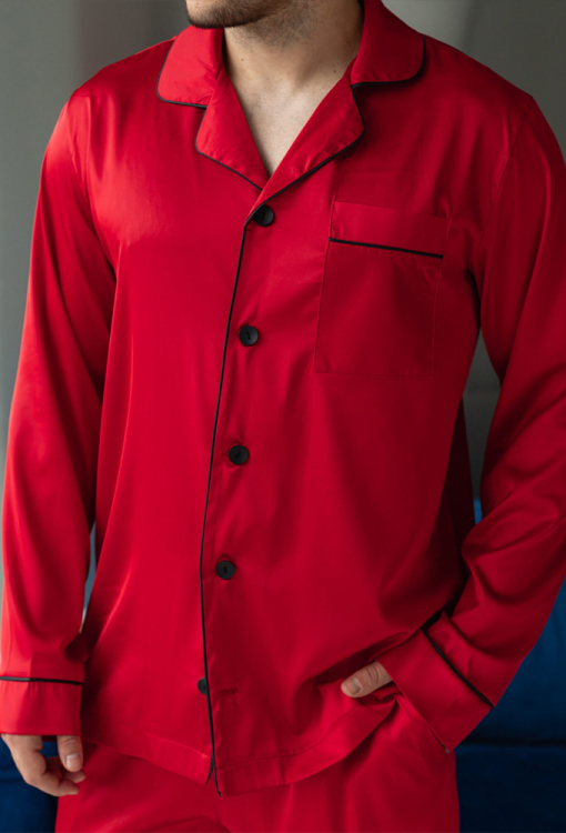 Яскрава чоловіча піжама від українського бренду BO.Brand. Піжама виконана з м'якого та якісного шовку Армані червоного кольору, складається з сорочки зі штанами прямого силуету. Сорочка з довгими рукавами та відкладним коміром, застібається на ґудзики. На грудях ліворуч виріб прикрашений накладною кишенею, комір, полиці, рукави та кишеня оброблені тонким кантом чорного кольору. Штани з м'якою гумкою в поясі та зручними бічними кишенями, внизу прикрашені чорним кантом. Піжама дуже красива і комфортна, дозволить відчути себе щасливим та розкішним, а також може бути відмінним подарунком коханій або близькій людині.