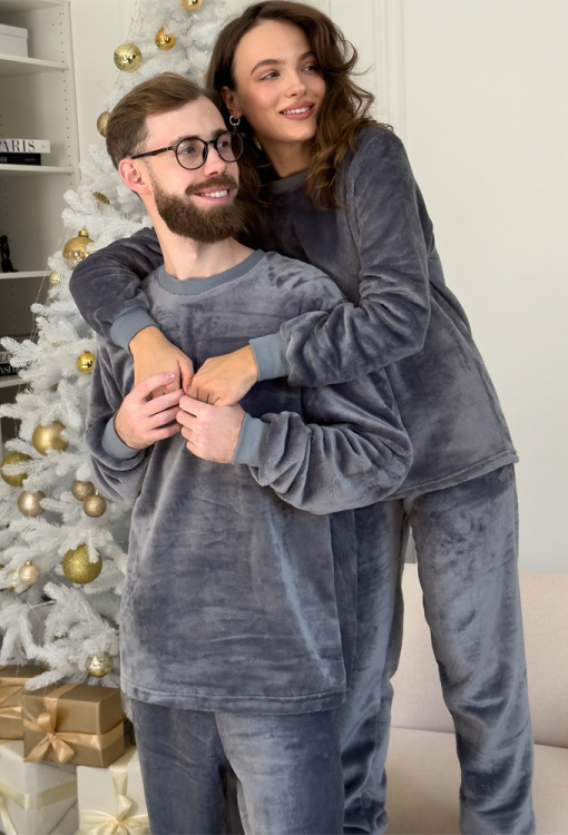 Зимова піжама чоловіча Теплик від українського бренду Cosy. Піжама виконана з якісного та м'якого велсофту сірого кольору, складається з кофти вільного крою та штанів на манжетах. Кофта з довгими рукавами та круглим вирізом горла, горловина та рукави оброблені трикотажними манжетами, штани з м'якою гумкою у поясі. Піжама красива і дуже комфортна, можна використовувати як одяг для дому або подарунок коханій та близькій людині.