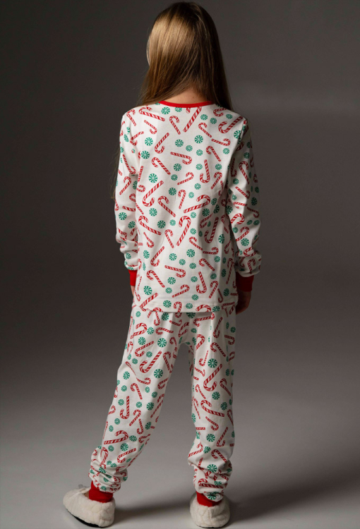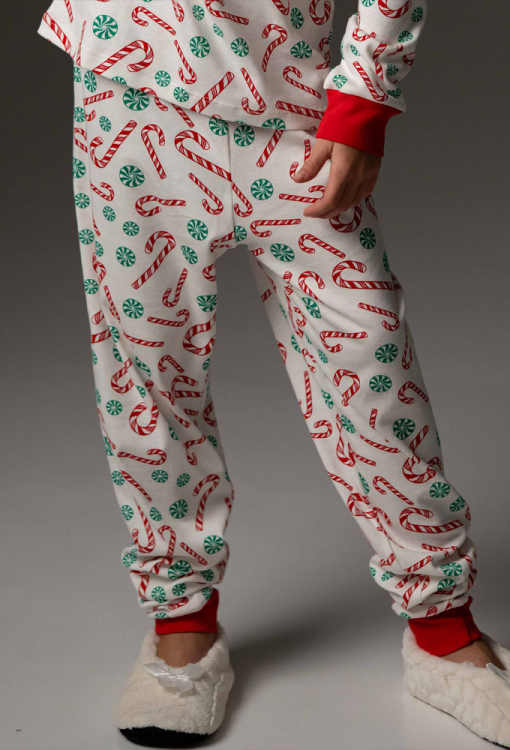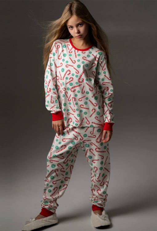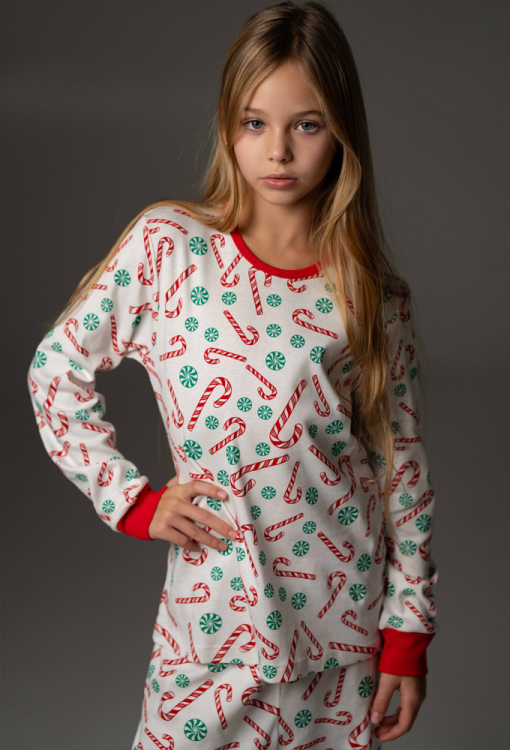 Новорічна дитяча піжама для дівчинки Candy від українського бренду German Volf. Піжама виконана з якісної та м'якої бавовни, кремового кольору з принтом у вигляді різдвяних солодощів червоного та зеленого кольору, складається з кофти та штанів. Кофта прямого силуету з довгими рукавами та круглим вирізом, рукави та горловина моделі оброблені манжетами червоного кольору. Штани з м'якою гумкою в поясі та червоними манжетами внизу. Піжама дуже красива та приємна до тіла, також може бути чудовим подарунком коханій дитині.