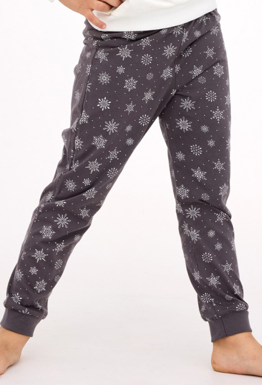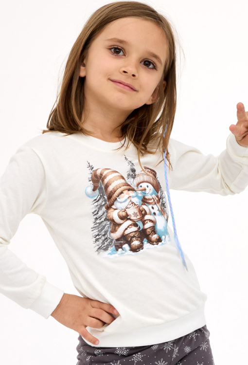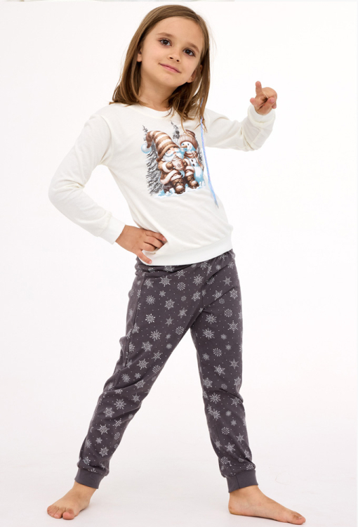 Новорічна дитяча піжама для дівчинки Friends від польського бренду Cornette. Піжама виконана з якісної та м'якої бавовни, складається з кофти кремового кольору та графітових штанів у принт з білих сніжинок. Кофта з довгими рукавами та круглим вирізом горла, рукава та низ оброблені манжетами. Спереду по центру модель прикрашена принтом у вигляді сніговика та гнома у зимовому лісі. Штани з м'якою гумкою в поясі та однотонними манжетами графітового кольору. Піжама дуже красива та комфортна, буде чудовим подарунком для коханої дитини на новорічні свята.