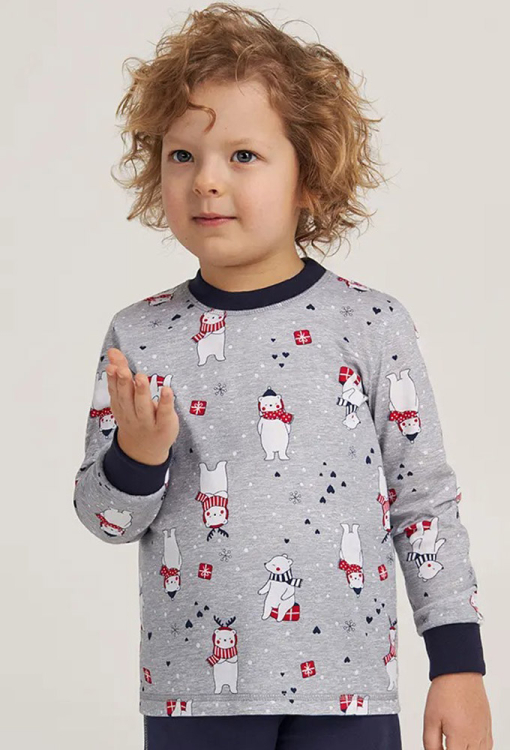 Тепла дитяча піжама для хлопчика із колекції Bear Club від українського бренду Ellen. Піжама виконана з якісного та щільного трикотажу з начосом на вивороті, складається з кофти сірого кольору в принт білих ведмедиків з червоними шарфами та різдвяними подарунками та синіх штанів. Кофта з довгими рукавами та круглим вирізом горла, горловина та рукави прикрашені синіми манжетами. Штани з м'якою гумкою в поясі та манжетами внизу. Піжама дуже красива та приємна до тіла, також може бути чудовим подарунком коханій дитині.