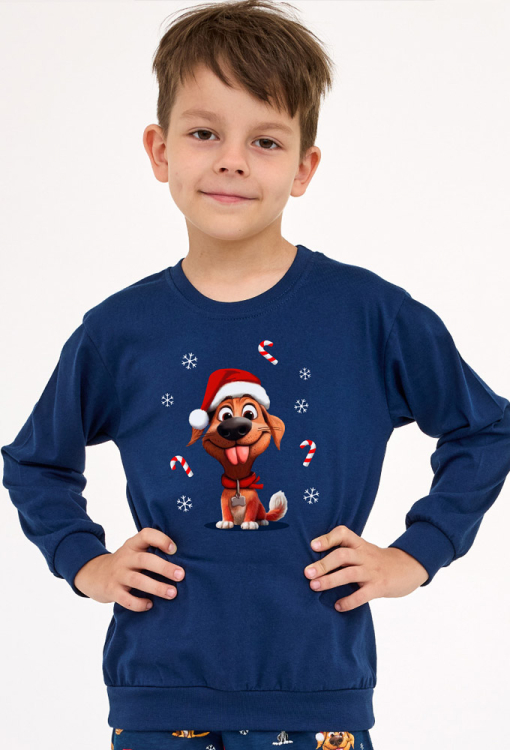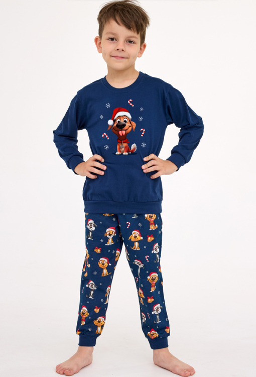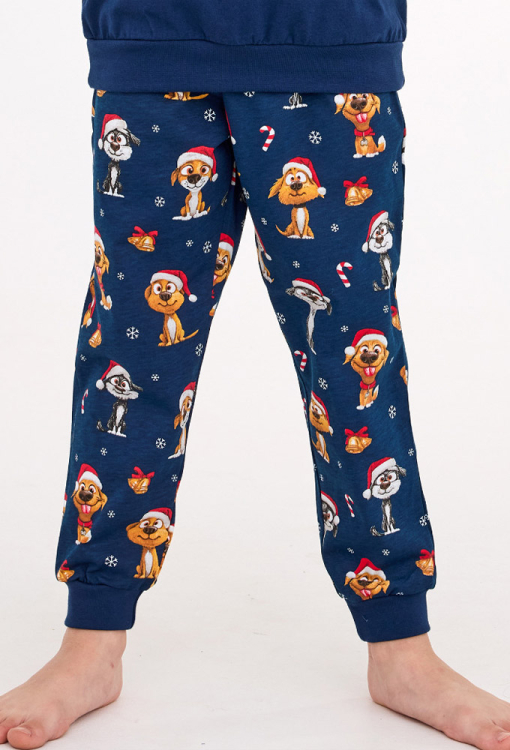 Новорічна дитяча піжама для хлопчика Dog від польського бренду Cornette. Піжама виконана з якісної та м'якої бавовни темно-синього кольору, складається з однотонної кофти та штанів з принтом кумедних собак та різдвяних солодощів. Кофта з довгими рукавами та круглим вирізом горла, рукава та низ на манжетах. Спереду по центру модель прикрашена принтом у вигляді смішної собачки в червоному ковпаку та сніжинок. Штани з м'якою гумкою у поясі, внизу оброблені зручними манжетами синього кольору. Піжама дуже красива та комфортна, також буде чудовим подарунком для коханої дитини.
