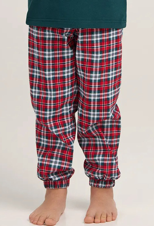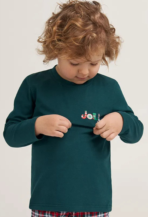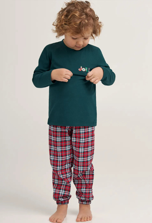 Стильна дитяча піжама для хлопчика із колекції Jolly від українського бренду Ellen. Піжама виконана з якісної та м'якої бавовни, складається з кофти зеленого кольору та червоних штанів у білий картатий принт із зеленим акцентом. Кофта з довгими рукавами та круглим вирізом горла, вгорі зліва прикрашена невеликим принтом у вигляді напису "Jolly" у різдвяному стилі. Штани з м'якою гумкою в поясі та еластичними манжетами внизу. Піжама дуже красива та приємна до тіла, також може бути чудовим подарунком коханій дитині.