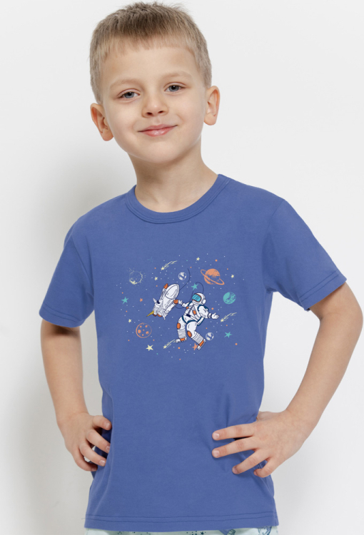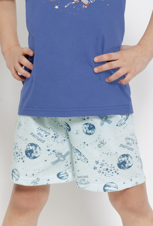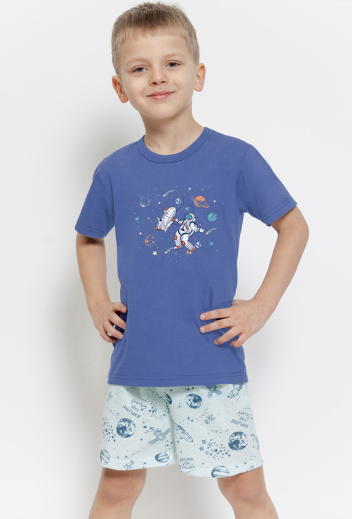 Зручна дитяча піжама для хлопчика Orion від польського бренду Taro. Піжама виконана з якісної та м'якої бавовни, складається з футболки синього кольору та білих шортів з принтом космічного простору. Футболка з короткими рукавами та круглим вирізом горла, спереду прикрашена яскравим принтом у вигляді космонавта з космічним кораблем та написів "explore the galaxy", шорти з м'якою гумкою в поясі. Піжама дуже красива та комфортна, ідеальна для теплих ночей та домашніх вечорів, також підійде для подарунка коханій дитині!
