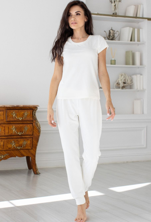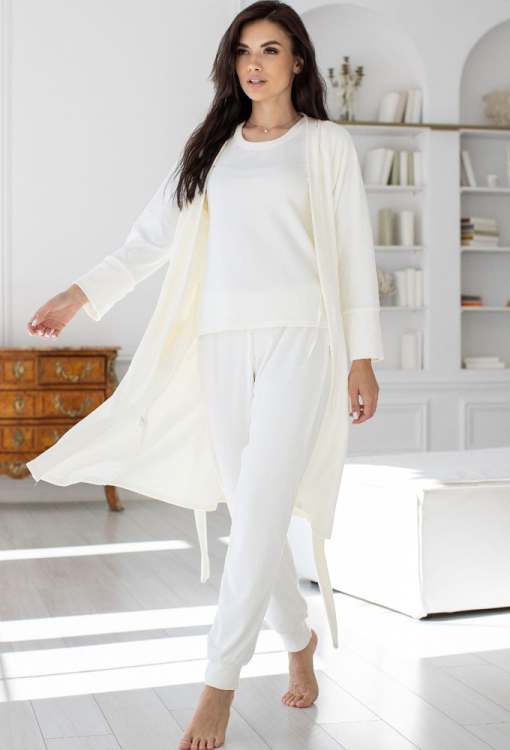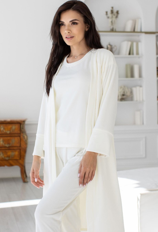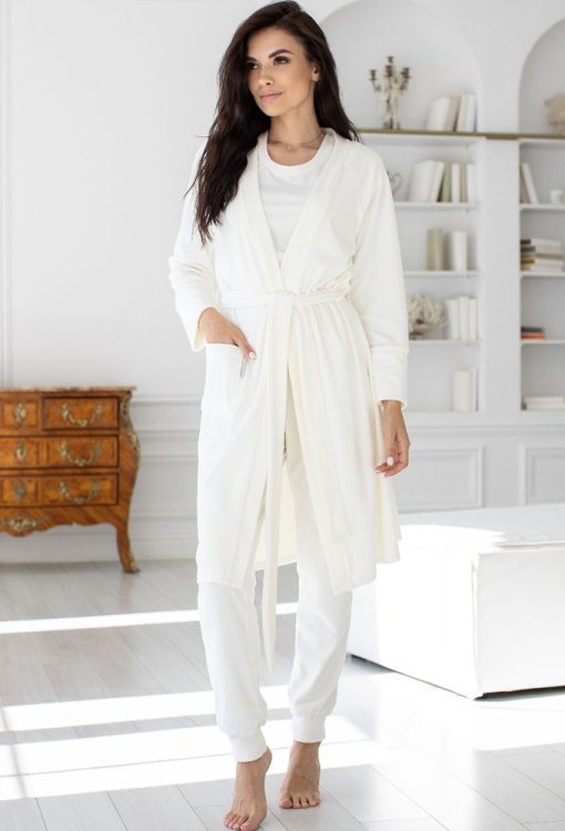 Ніжний комплект жіноча піжама з халатом від українського бренду MiaNaGreen. Комплект виконаний з м'якого та якісного велюру кремового кольору, складається з футболки, штанів та халату. Футболка прямого силуету, з короткими рукавами та круглим вирізом горла. Штани з м'якою гумкою у поясі, внизу оброблені манжетами. Халат з довгими рукавами та накладною кишенею праворуч, зав'язується на запах за допомогою пояса, рукави оброблені високими вільними манжетами. Комплект дуже красивий і приємний до тіла, ідеально підкреслить домашній образ, а також буде чудовим варіантом для подарунка коханій та близькій людині.