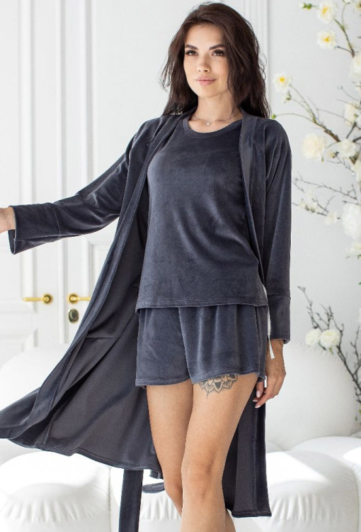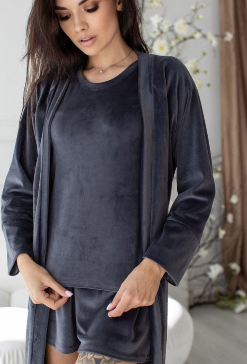Зручний комплект жіноча піжама з халатом від українського бренду MiaNaGreen. Комплект виконаний з м'якого та якісного велюру графітового кольору, складається з футболки, шортів та халату. Футболка прямого силуету, з короткими рукавами та круглим вирізом горла. Шорти з комфортною посадкою та м'якою гумкою в поясі. Халат з довгими рукавами та накладною кишенею праворуч, зав'язується на запах за допомогою пояса, рукави оброблені високими вільними манжетами. Комплект дуже красивий і приємний до тіла, ідеально підкреслить домашній образ, а також буде чудовим варіантом для подарунка коханій та близькій людині.