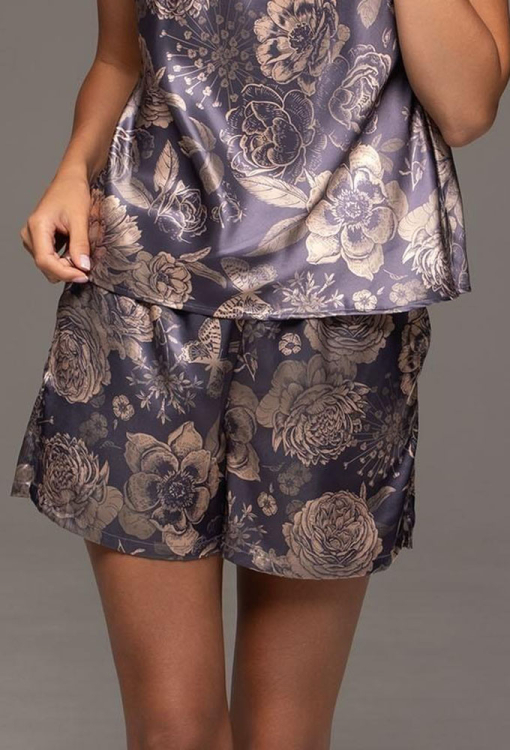 Елегантна жіноча піжама з колекції Giaconda від італійського бренду Mia-Amore створена для комфорту та витонченого образу. Піжама виконана із сумішевого полотна на основі натурального шовку, сіро-синього кольору з вишуканим квітковим принтом бежевого кольору. Комплект складається з майки вільного силуету та коротких шортів прямого крою. Майка на тонких бретелях, що регулюються, й з V-подібним декольте красиво підкреслює фігуру, не сковує рухів. Шорти з м'якою гумкою в поясі, створюють зручну посадку. Піжама дуже красива та зручна на кожен день, ідеально підходить для сну та домашнього відпочинку, а також може стати чудовим подарунком для близької людини.
