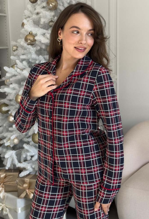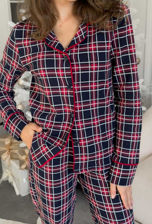 Тепла жіноча піжама Oxford від українського бренду Cosy. Піжама виконана з якісного і м'якого футера в синій з червоним картатий принт, лицьова сторона тканини гладка, а внутрішня з начосом, складається з сорочки та штанів. Сорочка класичного крою, з довгими рукавами та відкладним коміром, застібається на ґудзики. Комір, полиці та рукави моделі прикрашені тонким кантом червоного кольору. Штани прямого силуету, з м'якою гумкою в поясі та зручними кишенями, внизу і на кишенях оброблені червоним кантом. Піжама дуже красива та комфортна, справжній оберіг затишку та тепла в холодні зимові дні та ночі, а також може бути чудовим подарунком коханій та близькій людині.