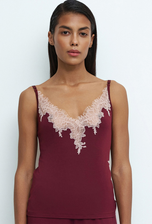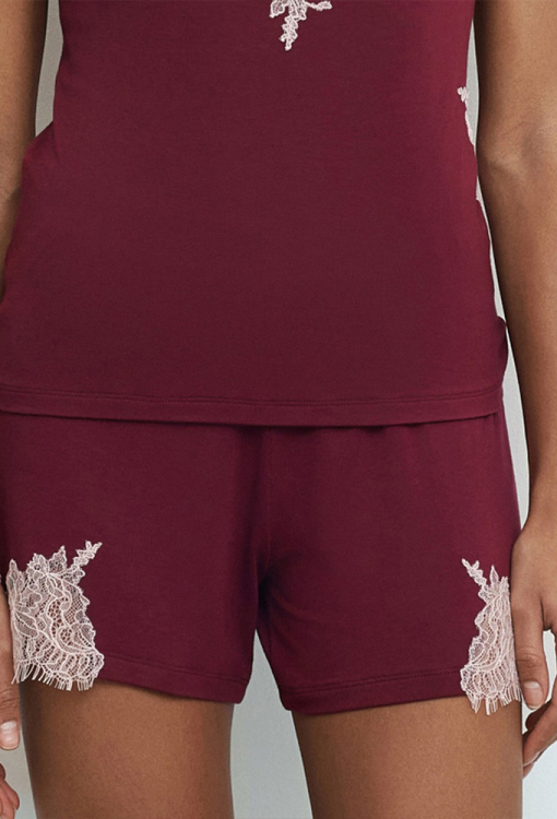 Витончена жіноча піжама з колекції Core від італійського бренду Effetto. Піжама виконана з м'якого та якісного бамбука бордового кольору, складається з майки напівприлеглого крою та шортів прямого силуету. Майка на тонких регульованих бретелях та з V-подібним декольте, по лінії вирізу та на полиці зліва прикрашена вставками та аплікаціями з ніжного мережива Chantilly кремового кольору. Шорти зі зручною посадкою та м'якою гумкою в поясі, з боків також прикрашені вирізним мереживом із віями. Піжама дуже красива та комфортна, ідеальна для сну та домашнього відпочинку, а також може бути чудовим подарунком коханій та близькій людині.
