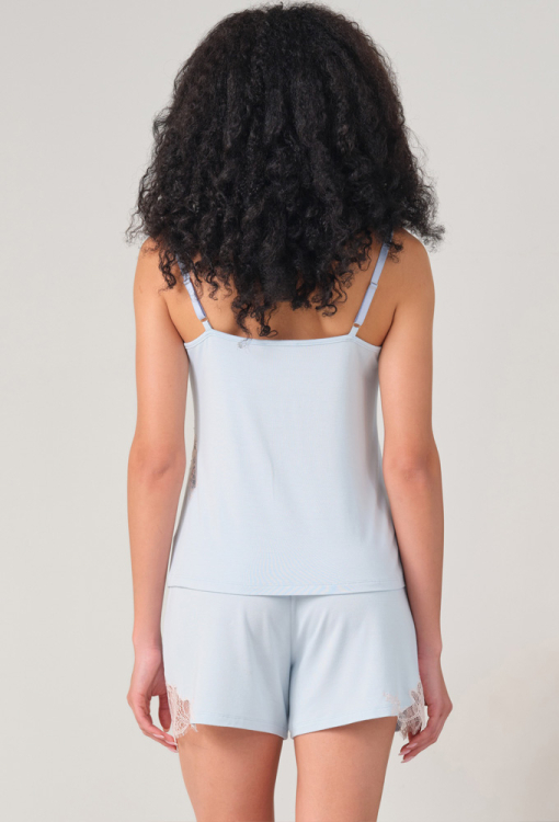Витончена жіноча піжама з колекції Core від італійського бренду Effetto. Піжама виконана з м'якого та якісного бамбука блакитного кольору, складається з майки напівприлеглого крою та шортів прямого силуету. Майка на тонких регульованих бретелях та з V-подібним декольте, по лінії вирізу та на полиці зліва прикрашена вставками та аплікаціями з ніжного мережива Chantilly кремового кольору. Шорти зі зручною посадкою та м'якою гумкою в поясі, з боків також прикрашені вирізним мереживом із віями. Піжама дуже красива та комфортна, ідеальна для сну та домашнього відпочинку, а також може бути чудовим подарунком коханій та близькій людині.