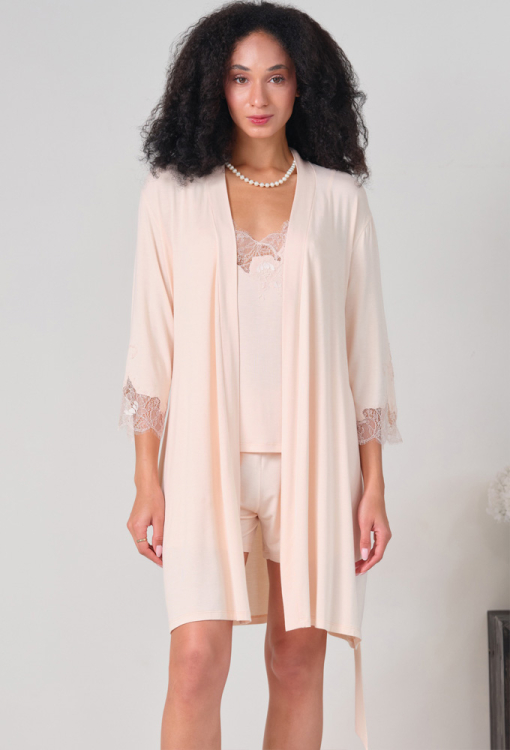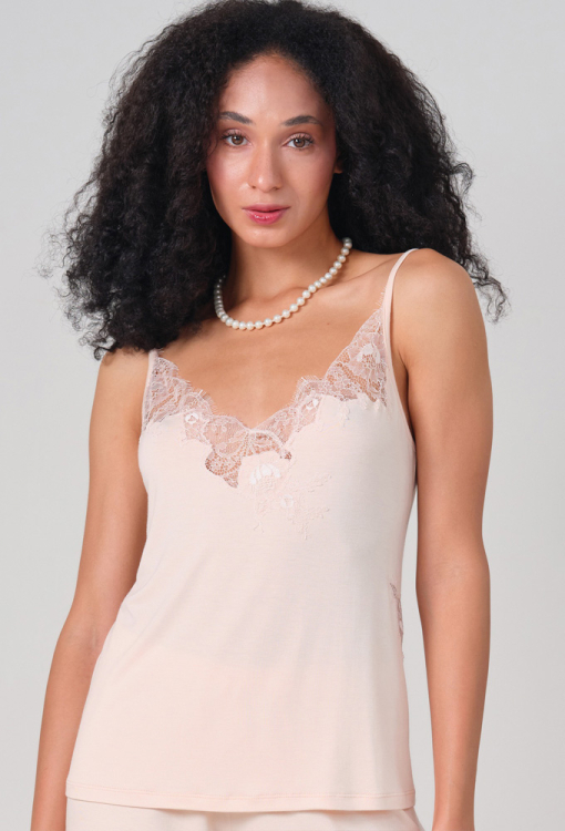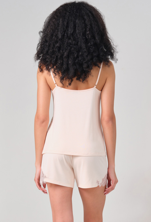 Витончена жіноча піжама з колекції Core від італійського бренду Effetto. Піжама виконана з м'якого та якісного бамбука персикового кольору, складається з майки напівприлеглого крою та шортів прямого силуету. Майка на тонких регульованих бретелях та з V-подібним декольте, по лінії вирізу та на полиці зліва прикрашена вставками та аплікаціями з ніжного мережива Chantilly кремового кольору. Шорти зі зручною посадкою та м'якою гумкою в поясі, з боків також прикрашені вирізним мереживом із віями. Піжама дуже красива та комфортна, ідеальна для сну та домашнього відпочинку, а також може бути чудовим подарунком коханій та близькій людині.