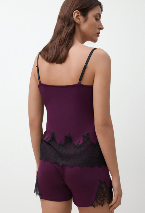 Чарівна жіноча піжама з колекції Elegent Enigma від італійського бренду Effetto. Піжама виконана з м'якого та якісного бамбука фіолетового кольору, складається з майки напівприлеглого силуету та шорт прямого крою. Майка з тонкими регульованими бретелями чорного кольору та V-подібним декольте. По лінії вирізу та внизу модель оздоблена широкими вставками з ажурного мережива з вирізним краєм чорного кольору. Шорти зі зручною посадкою та м'якою гумкою в поясі, з боків унизу оброблені чорними мереживними вставками. Піжама дуже красива і комфортна, прекрасний вибір для сну та домашнього відпочинку, а також може бути чудовим подарунком коханій та близькій людині.