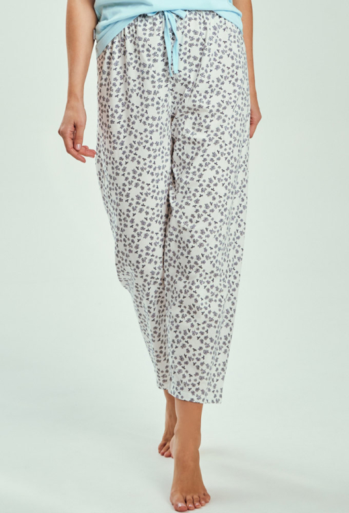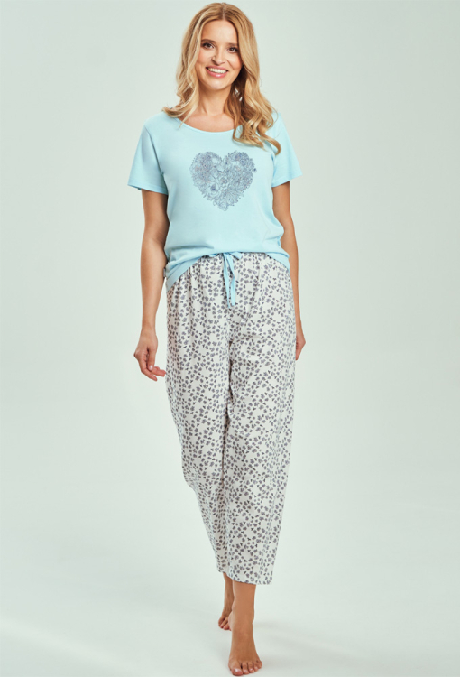 Стильна жіноча піжама Alessia від польського бренду Taro. Піжама виконана з якісної та м'якої бавовни, складається з футболки бірюзового кольору та білих капрі у дрібні квіточки бузкового кольору. Футболка прямого силуету, з короткими рукавами та круглим вирізом горла, спереду прикрашена принтом у вигляді великого серця із дрібних квітів. Капрі зі зручною посадкою та м'якою гумкою в поясі, регулюються по ширині за допомогою внутрішнього шнурка бірюзового кольору. Піжама стильна і дуже комфортна, ідеальна для приємного сну та затишного домашнього відпочинку, а також може бути чудовим подарунком коханій або близькій людині.