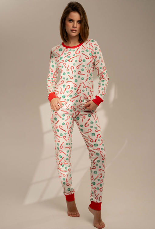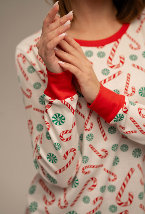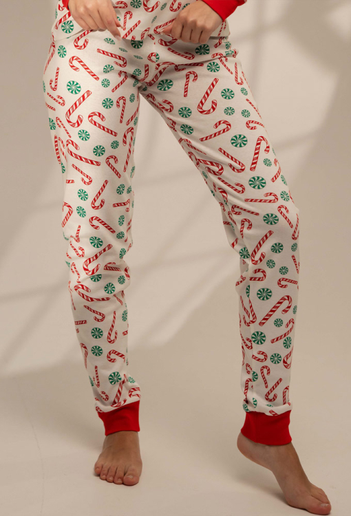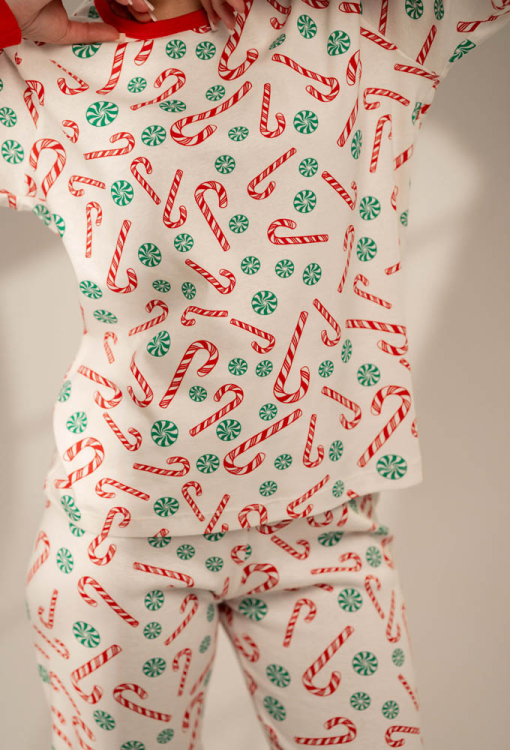 Яскрава жіноча новорічна піжама Candy Cane від українського бренду German Volf. Піжама виконана з якісної та м'якої бавовни, кремового кольору з принтом у вигляді різдвяних карамельок червоного та зеленого кольору, складається з кофти та штанів. Кофта прямого силуету з довгими рукавами та круглим вирізом, рукави, горловина та низ моделі оброблені манжетами червоного кольору. Штани з м'якою гумкою в поясі та манжетами внизу, створюють зручну посадку та забезпечують свободу рухів. Піжама дуже красива та комфортна, підійде як для сну, так і для домашнього відпочинку, а також може бути чудовим подарунком близькій чи коханій людині на новорічні свята!
