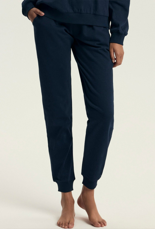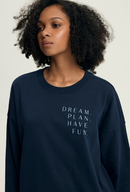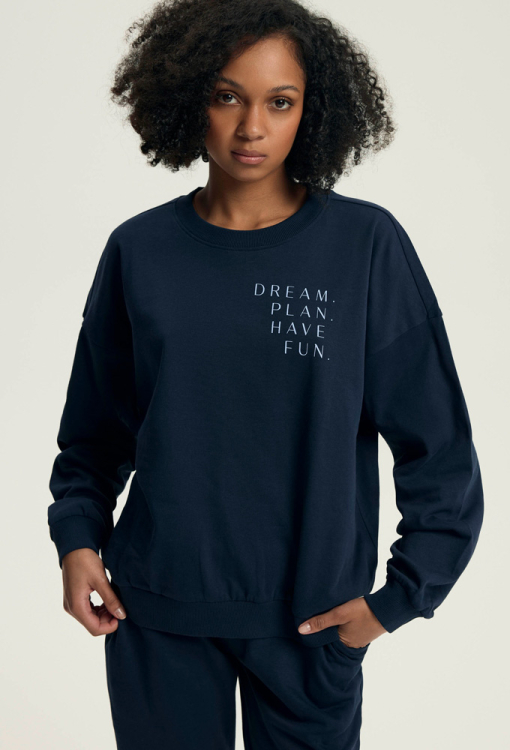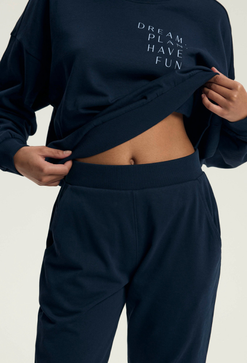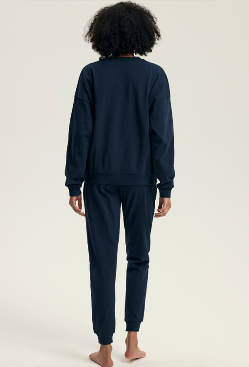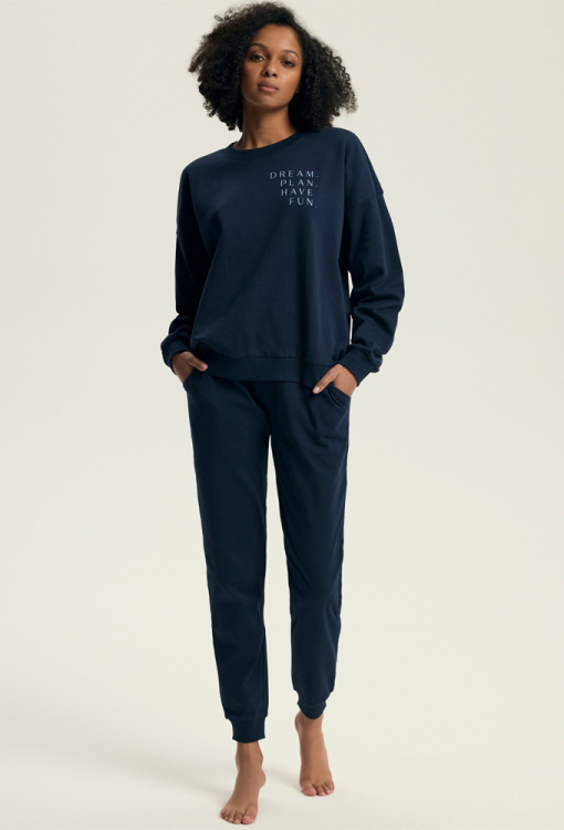 Модна та зручна жіноча піжама Delancy від польського бренду Henderson Ladies. Піжама виконана з м'якої та якісної бавовни темно-синього кольору, складається з кофти вільного силуету та штанів на манжетах. Кофта з довгими рукавами та з круглим вирізом горла, виріз, рукави та низ оброблені зручними манжетами, вгорі зліва модель прикрашена написом "Dream. Plan. Have. Fun". Штани зі зручною посадкою, м'якою гумкою в поясі та бічними кишенями. Піжама дуже красива і комфортна, також буде відмінним варіантом одягу для дому або корисним подарунком коханій та близькій людині.