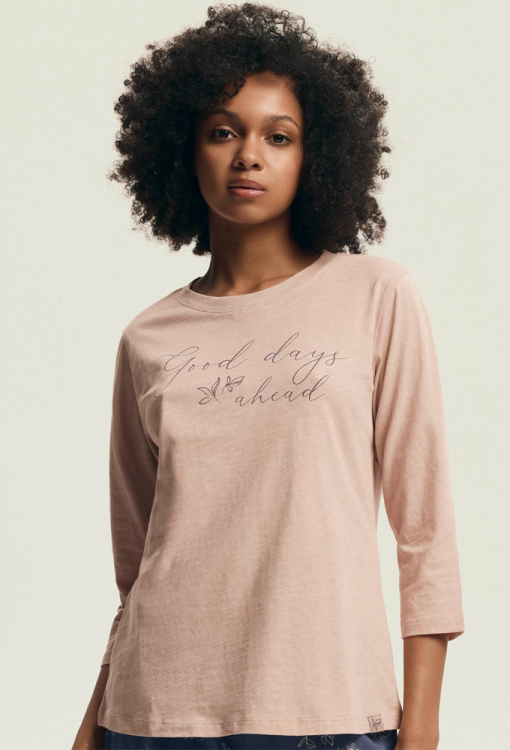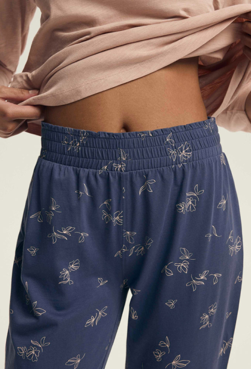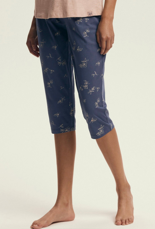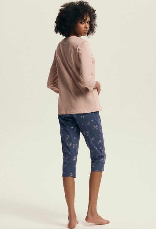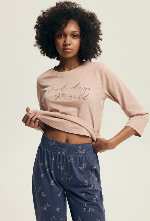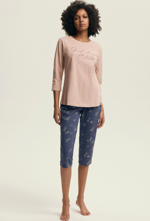 Зручна та модна жіноча піжама Delanie від польського бренду Henderson Ladies. Піжама виконана з м'якої та якісної бавовни, складається з кофти кольору пудри та бридж джинсового кольору в ніжний контурний принт у вигляді квітів. Кофта прямого силуету, з рукавами 3/4 та круглим вирізом горла, на рівні грудей прикрашена написом "good days ahead". Бриджі прямого крою, зі зручною посадкою та м'якою гумкою в поясі. Піжама дуже красива і комфортна, також буде відмінним варіантом одягу для дому або корисним подарунком коханій та близькій людині.