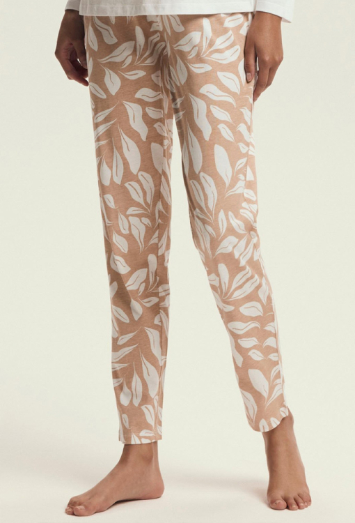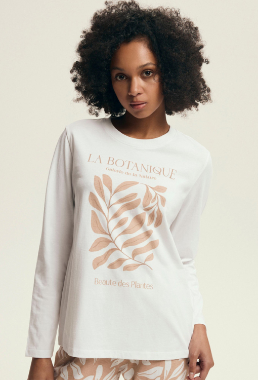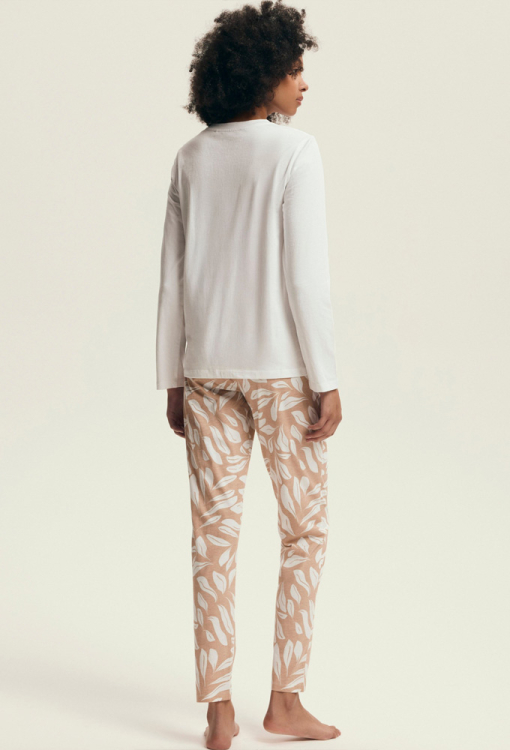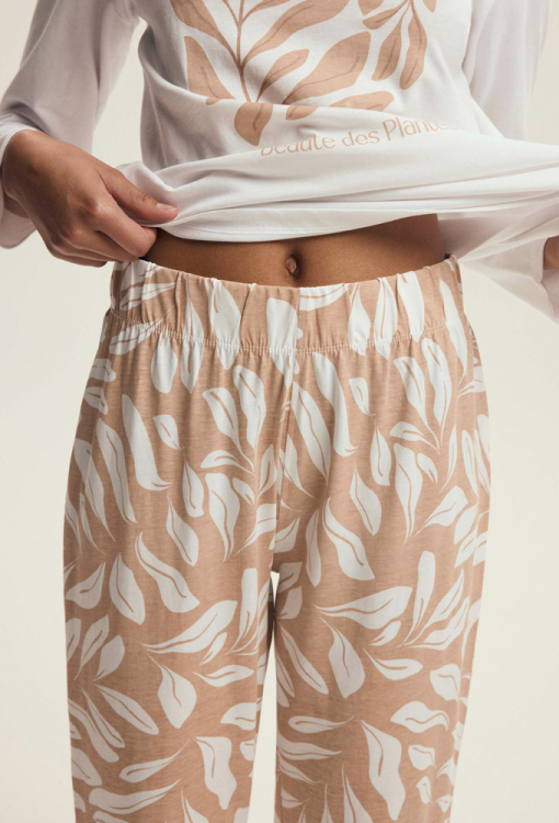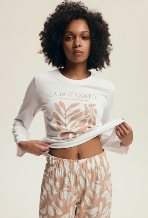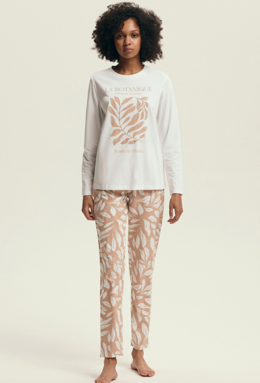 Стильна та комфортна жіноча піжама Dextra від польського бренду Henderson Ladies. Піжама виконана з м'якої та якісної бавовни, складається з кофти кремового кольору та бежевих штанів з принтом із листя кремового кольору. Кофта прямого силуету, з довгими рукавами й з круглим вирізом горла, штани також прямі зі зручною посадкою та м'якою гумкою в поясі. Передня полиця кофти прикрашена принтом у вигляді гілок із листям бежевого кольору та написом "La botanique". Піжама дуже красива і зручна, також буде відмінним варіантом одягу для дому або корисним подарунком коханій та близькій людині.