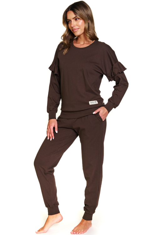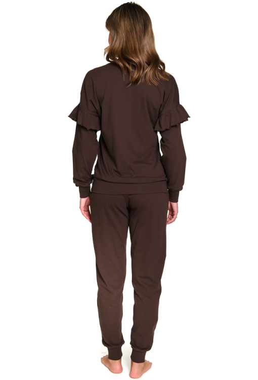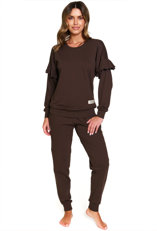 Чарівна жіноча піжама від польського бренду Doctor Nap. Піжама виконана з високоякісної та м'якої бавовни коричневого кольору, складається з кофти з довгими рукавами та штанів на манжетах. Кофта прямого силуету та з круглим вирізом горла, низ моделі оброблений манжетою, рукави прикрашені грайливим рюшем. Штани зі зручною посадкою, м'якою гумкою в поясі та зручними бічними кишенями. Піжама красива і дуже комфортна, ідеальна для домашніх вечорів та ночей, також може бути чудовим подарунком коханій та близькій людині.