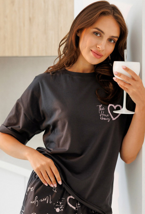 Комфортна жіноча піжама з колекції Don't Worry від українського бренду Roksana. Піжама виконана з м'якої та якісної бавовни графітового кольору, складається з однотонної Футболки та шорт з принтом у вигляді контурних сердець та написів "Love" в рожевих тонах. Футболка вільного силуету, з короткими рукавами і круглим вирізом горла, вгорі зліва прикрашена рожевим принтом серця з написом. Шорти прямого крою та з м'якою гумкою в поясі. Піжама дуже красива і приємна до тіла, ідеальна для сну, ранкових зборів та вечірнього релаксу вдома, також може бути чудовим подарунком коханій та близькій людині.