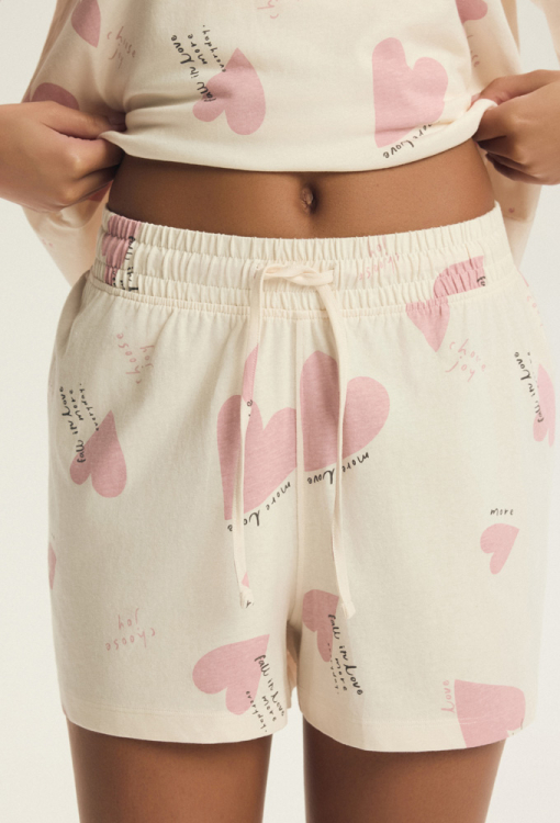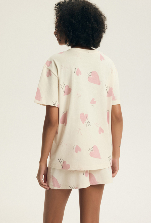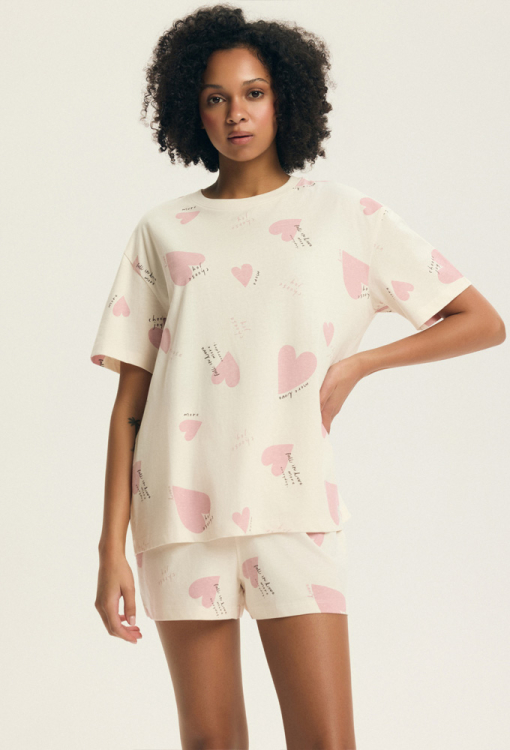 Класична жіноча піжама Elain від польського бренду Henderson Ladies. Піжама виконана з м'якої та якісної бавовни, ніжно-рожевого кольору з принтом у вигляді великих сердечок рожевого кольору та написів, складається з футболки та шортів вільного силуету. Футболка з короткими рукавами, заниженим плечовим швом та круглим вирізом горла. Шорти зі зручною посадкою та м'якою гумкою в поясі, регулюються по ширині за допомогою внутрішнього шнурка. Піжама дуже красива і комфортна, також буде відмінним варіантом одягу для дому або корисним подарунком коханій та близькій людині.