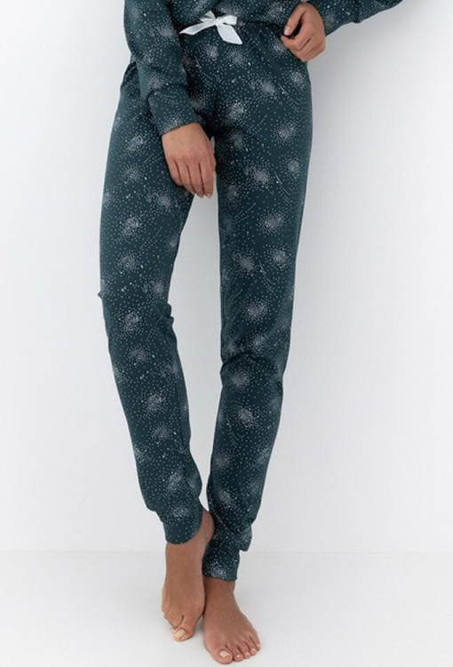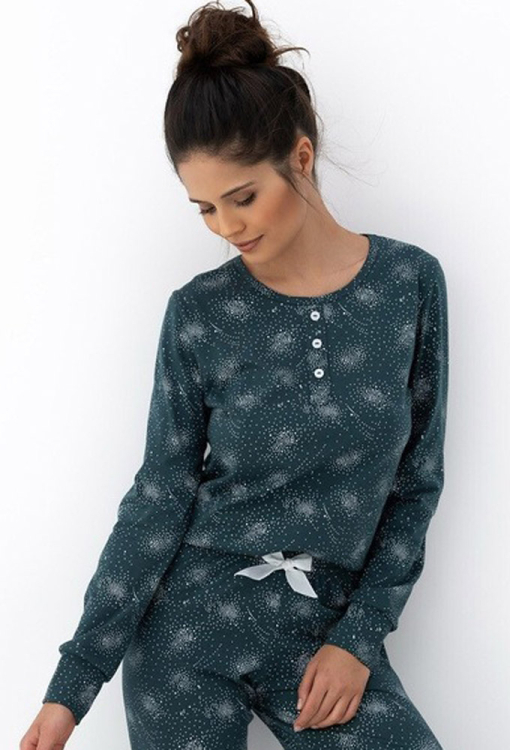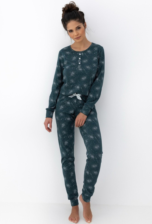 Комфортна жіноча піжама Ellison від польського бренду Sensis. Піжама виконана з якісної та м'якої бавовни, зеленого кольору з принтом у вигляді білих крапок, складається з кофти прямого силуету та штанів на манжетах. Кофта з довгими рукавами на манжетах та акуратним круглим вирізом, прикрашеним планкою з ґудзиками - ідеальний варіант для затишних домашніх моментів. Штани зі зручною посадкою та м'якою гумкою у поясі, прикрашені білим атласним бантиком, що надає образу делікатної жіночності. Піжама не тільки приваблива і неймовірно зручна - вона легко стає улюбленим домашнім комплектом та відмінним подарунком для коханої чи близької людини.