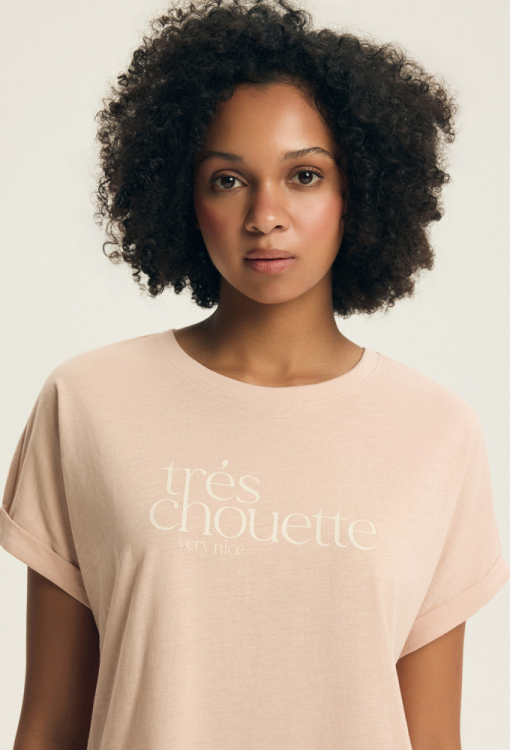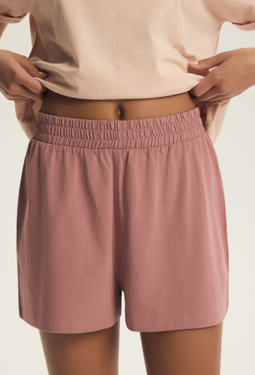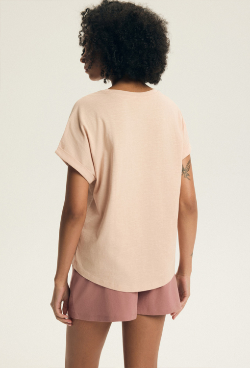 Класична жіноча піжама Emala від польського бренду Henderson Ladies. Піжама виконана з м'якої та якісної бавовни, складається з футболки персикового кольору та темно-рожевих шортів. Футболка вільного силуету, з короткими рукавами та круглим вирізом горла. Вгорі модель прикрашена принтом із напису, рукави оброблені відкладними манжетами. Шорти вільного крою, зі зручною посадкою та м'якою гумкою в поясі. Піжама дуже красива і комфортна, також буде відмінним варіантом одягу для дому або корисним подарунком коханій та близькій людині.