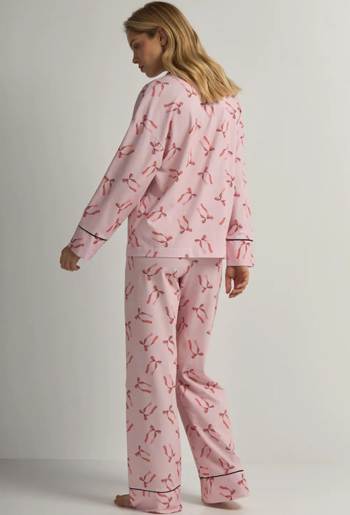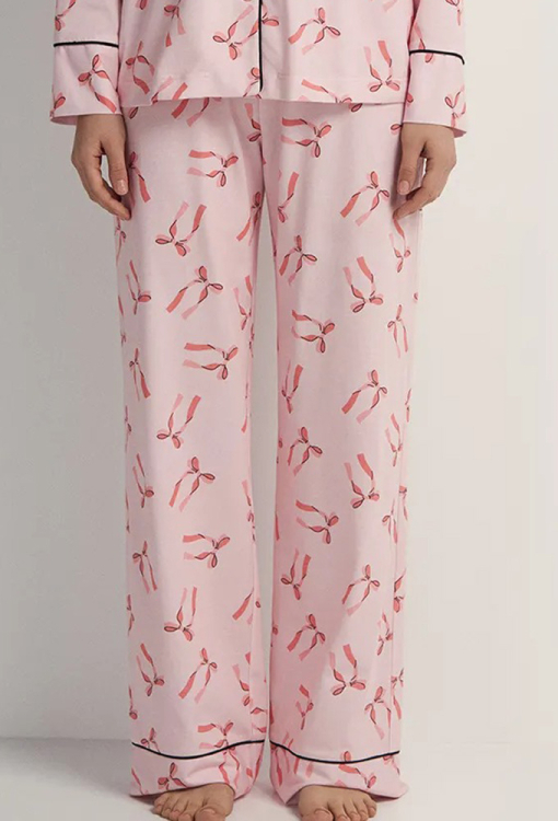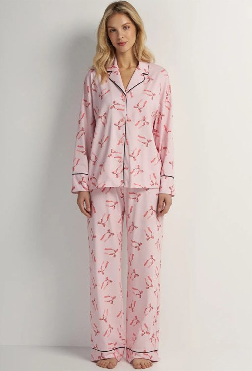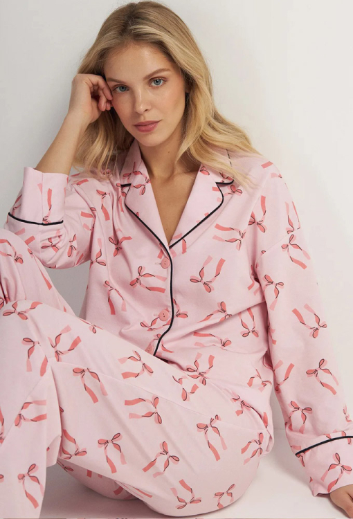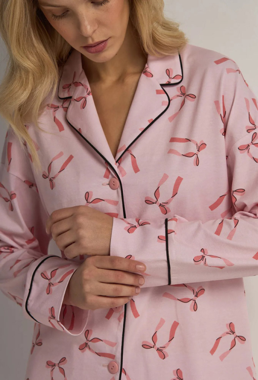 Чарівна жіноча піжама з колекції Flirty від українського бренду Ellen. Піжама виконана з якісної та м'якої бавовни ніжно-рожевого кольору в принт з рожевих бантиків з чорним контуром, складається з сорочки та штанів. Сорочка прямого силуету, з довгими рукавами та відкладним коміром, застібається на ґудзики. Комір, полиці та рукави моделі прикрашені тонким кантом чорного кольору. Штани також прямого крою та з м'якою гумкою в поясі, внизу оброблені контрастним кантом. Піжама дуже красива і комфортна, також може бути чудовим одягом для дому або корисним подарунком коханій та близькій людині.