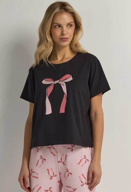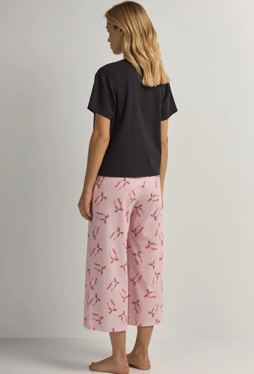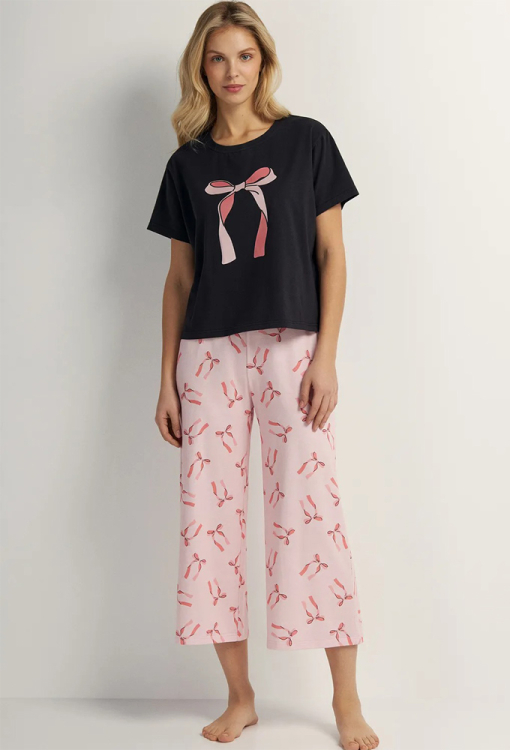 Стильна жіноча піжама з колекції Flirty від українського бренду Ellen. Піжама виконана з якісної та м'якої бавовни, складається з футболки чорного кольору та капрі ніжно-рожевого кольору в принт із рожевих бантиків, футболка прямого силуету, з короткими рукавами та круглим вирізом горла, спереду по центру прикрашена принтом у вигляді великого рожевого банта. Капрі вільні та з м'якою гумкою в поясі. Піжама дуже красива і комфортна, також може бути чудовим одягом для дому або корисним подарунком коханій та близькій людині.