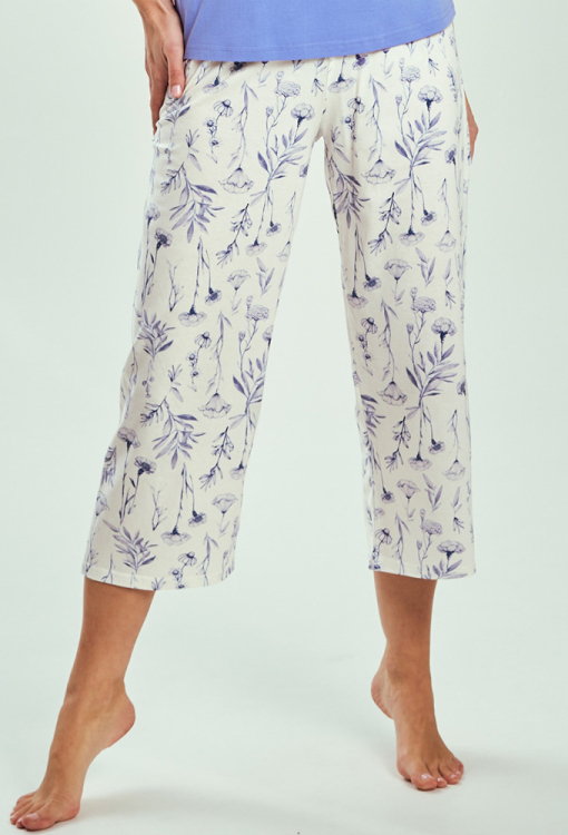 Красива жіноча піжама Alessia від польського бренду Taro. Піжама виконана з якісної та м'якої бавовни, складається з футболки блакитного кольору та білих капрі в принт із польових квітів фіолетового кольору. Футболка прямого силуету, з короткими рукавами та круглим вирізом горла, спереду прикрашена принтом у вигляді великої квітки. Капрі зі зручною посадкою та м'якою гумкою в поясі. Піжама стильна і дуже комфортна, ідеальна для приємного сну та затишного домашнього відпочинку, а також може бути чудовим подарунком коханій або близькій людині.