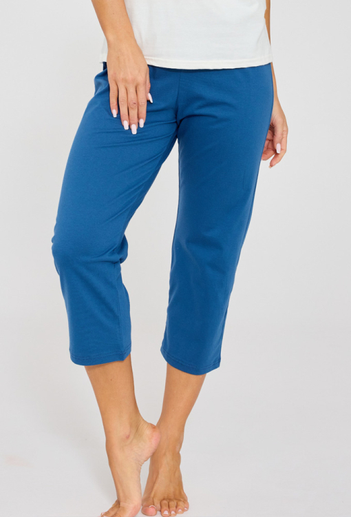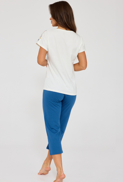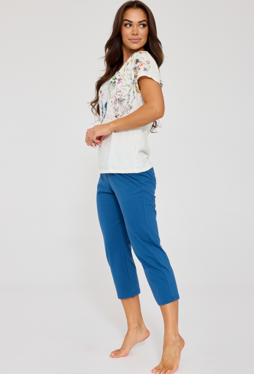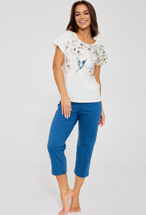 Стильна жіноча піжама Violetta від польського бренду Cornette. Піжама виконана з якісної та м'якої бавовни, складається з футболки кремового кольору та синіх капрі. Футболка прямого силуету, з короткими рукавами й круглим вирізом горла, прямі капрі та з м'якою гумкою в поясі. Верхня частина футболки прикрашена яскравим принтом у вигляді квітів та птахів колібрі в синіх відтінках. Піжама стильна і дуже комфортна, ідеальна для сну, вечірнього відпочинку та неспішного ранку вдома, також може бути чудовим подарунком коханій та близькій людині.