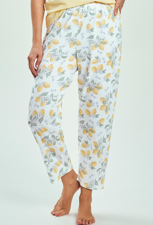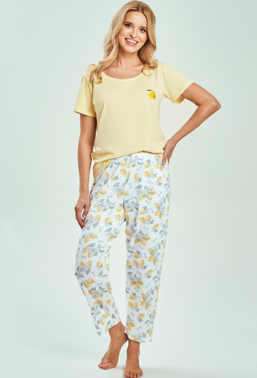Яскрава жіноча піжама Frida від польського бренду Taro. Піжама виконана з якісної та м'якої бавовни, складається з футболки жовтого кольору та білих капрі з принтом у вигляді жовтих лимонів із зеленим листям та білими квітами. Футболка прямого силуету, з короткими рукавами та круглим вирізом горла, вгорі зліва прикрашена принтом із лимона та написом. Капрі також прямого крою зі зручною посадкою та м'якою гумкою у поясі. Піжама дуже красива та зручна, ідеальна для літніх теплих ночей та домашнього відпочинку, а також може бути чудовим подарунком коханій чи близькій людині.