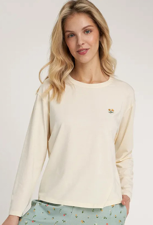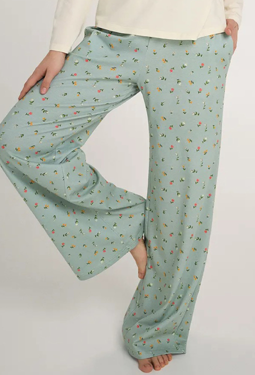 Стильна жіноча піжама з колекції Green Meadow від українського бренду Ellen. Піжама виконана з якісної та м'якої бавовни, складається з кофти кремового кольору та штанів зеленого кольору у квітковий принт рожевого та оранжевого кольору, Кофта прямого силуету, з довгими рукавами та круглим вирізом горла, вгорі зліва прикрашена ніжним принтом букетика з квітами. Штани вільного крою, з м'якою гумкою в поясі, та зручними бічними кишенями. Піжама дуже красива і комфортна, також може бути чудовим одягом для дому або корисним подарунком коханій та близькій людині.