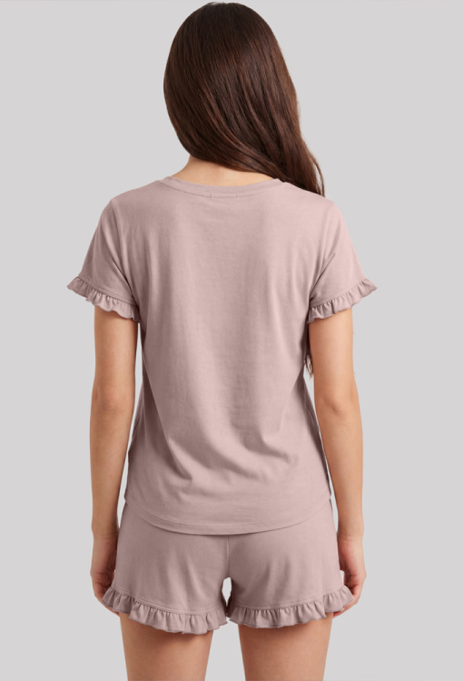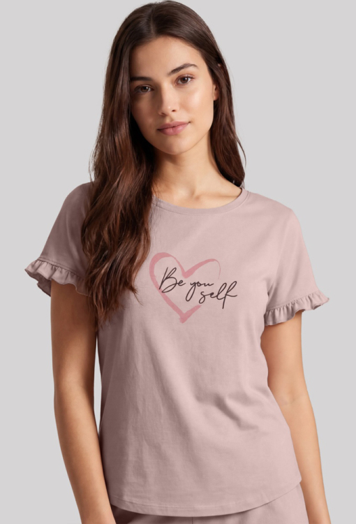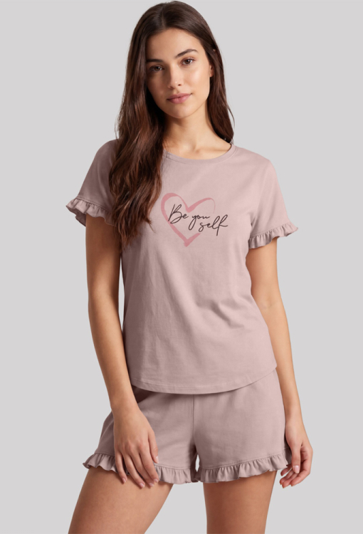 Чудова жіноча піжама з колекції Janetta від українського бренду Roksana. Піжама виконана з м'якої та якісної бавовни кавового кольору, складається з футболки та шортів прямого силуету. Футболка з короткими рукавами та круглим вирізом горла, на рукавах оброблена рюшами, на грудях по центру прикрашена принтом у вигляді контурного серця та написом "Be you self". Шорти з м'якою гумкою у поясі, внизу оформлені рюшами. Піжама дуже красива і приємна до тіла, ідеальна для сну та затишного домашнього відпочинку, а також може бути корисним подарунком коханій та близькій людині.