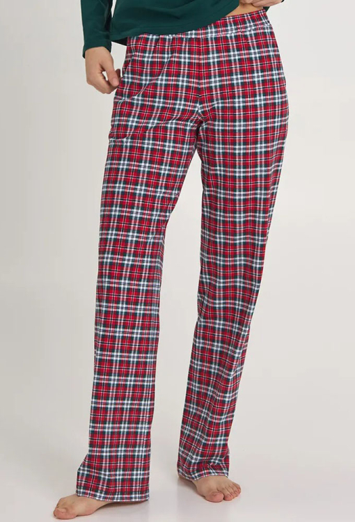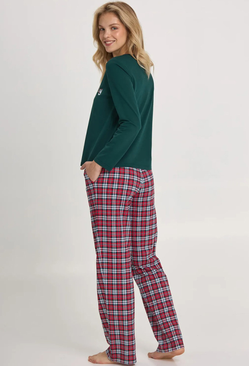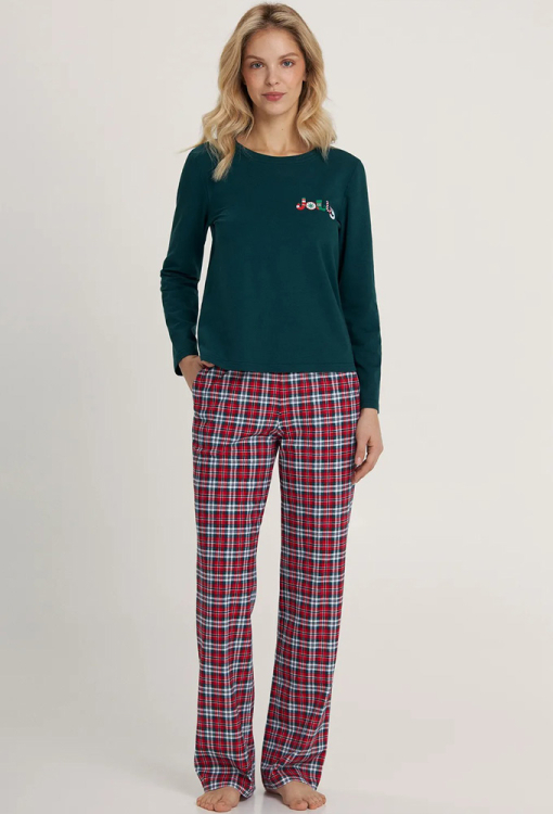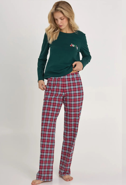 Яскрава жіноча піжама з колекції Jolly від українського бренду Ellen. Піжама виконана з якісної та м'якої бавовни, складається з кофти зеленого кольору та червоних штанів у білий принт із зеленим акцентом. Кофта прямого силуету, з довгими рукавами та круглим вирізом горла, вгорі зліва прикрашена принтом із напису "Jolly" у різдвяному стилі. Штани також прямого крою, з м'якою гумкою в поясі та зручними бічними кишенями. Піжама дуже красива і комфортна, також може бути чудовим одягом для дому або корисним подарунком коханій та близькій людині.