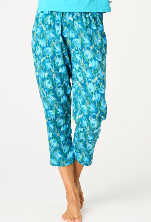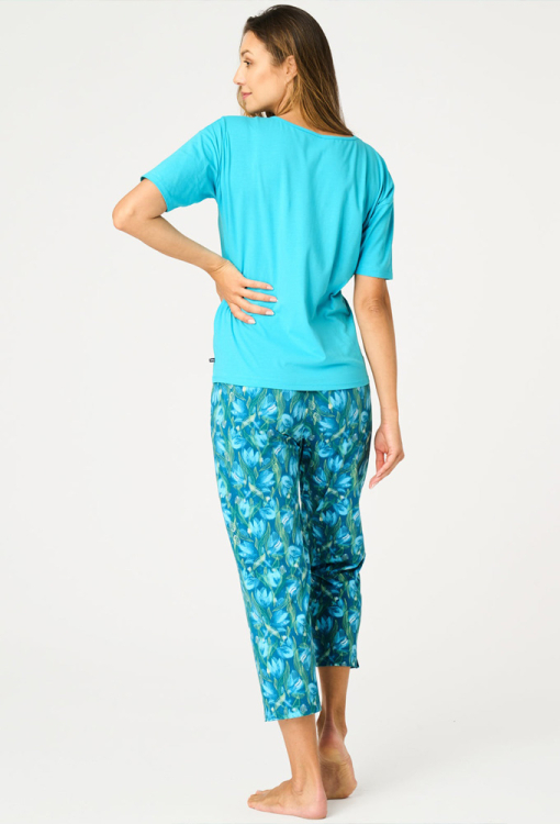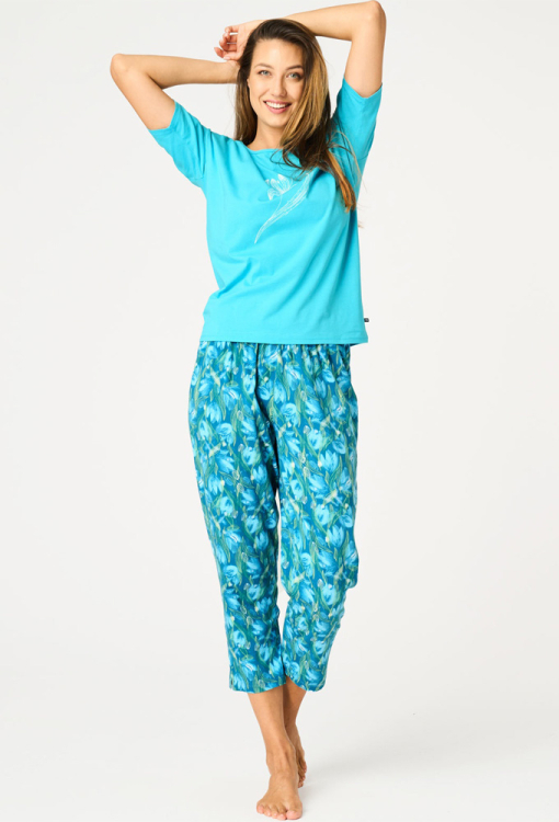 Яскрава жіноча піжама від польського бренду Key. Піжама виконана з якісної та м'якої бавовни, складається з футболки бірюзового кольору та синіх капрі з принтом у вигляді бірюзових тюльпанів. Футболка прямого силуету, з короткими рукавами та круглим вирізом горла, спереду прикрашена ніжним тюльпановим принтом. Капрі прямого крою, з м'якою гумкою в поясі та невеликими бічними розрізами внизу. Піжама красива і дуже комфортна, ідеальна для розслаблюючих вечорів та радісних ранкових моментів, також може бути чудовим подарунком коханій та близькій людині.