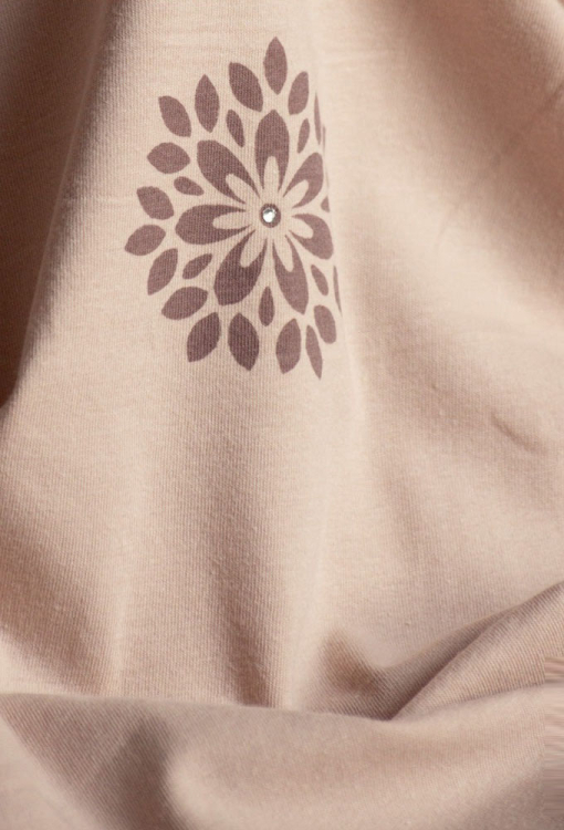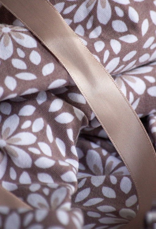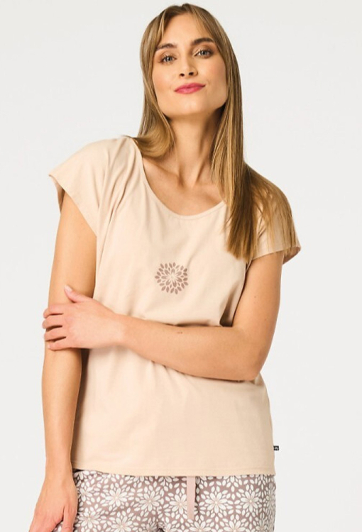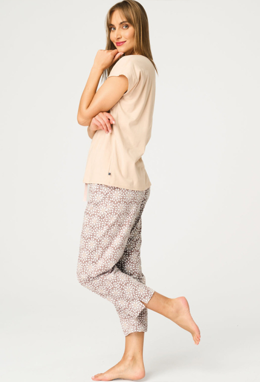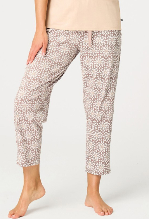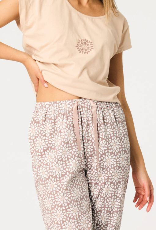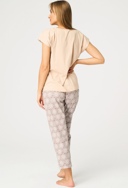 Елегантна жіноча піжама від польського бренду Key. Піжама виконана з якісної та м'якої бавовни, складається з футболки бежевого кольору та коричневих штанів з принтом у вигляді білих ромашок. Футболка вільного силуету з короткими рукавами та круглим вирізом горла, спереду прикрашена ніжним принтом в етнічному стилі у вигляді ромашки коричневого кольору з бусинкою у центрі. Штани прямого крою, з м'якою гумкою в поясі та зручними бічними кишенями, на талії прикрашені атласною стрічкою бежевого кольору. Піжама дуже красива і комфортна, ідеально підходить для розслаблюючих вечорів будинку або гарного нічного сну, також може бути корисним подарунком коханій та близькій людині.