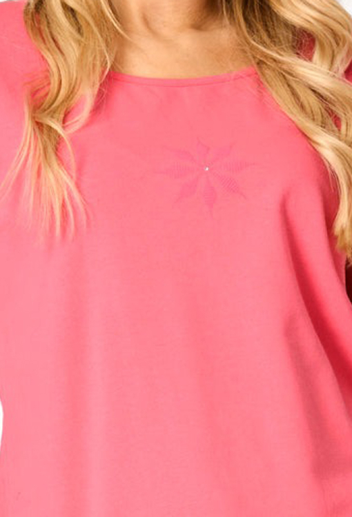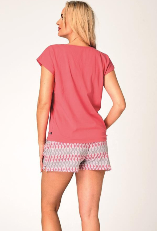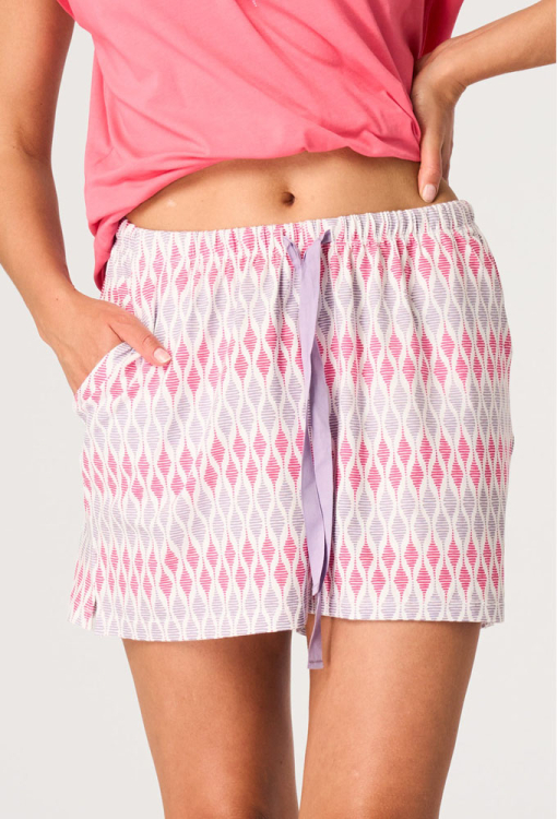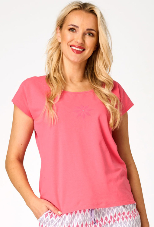 Легка жіноча піжама від польського бренду Key. Піжама виконана з якісної та м'якої бавовни, складається з футболки рожевого кольору та шорт з принтом у вигляді орнаменту рожевого та лілового кольору. Футболка вільного силуету з короткими рукавами та круглим вирізом горла, спереду прикрашена витонченою етнічною квіткою з блискучою бусинкою в центрі. Шорти вільного крою, з м'якою гумкою в поясі та зручними бічними кишенями, регулюються за шириною за допомогою внутрішнього шнурка лілового кольору. Піжама дуже красива і комфортна, ідеально підходить для розслаблюючих вечорів будинку або гарного нічного сну, також може бути корисним подарунком коханій та близькій людині.