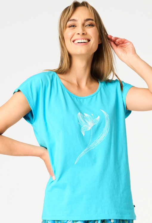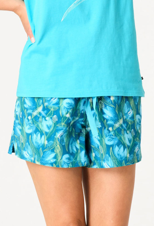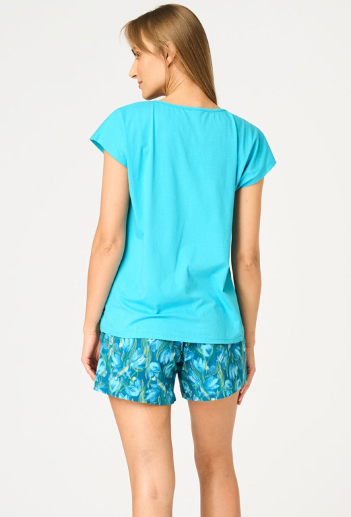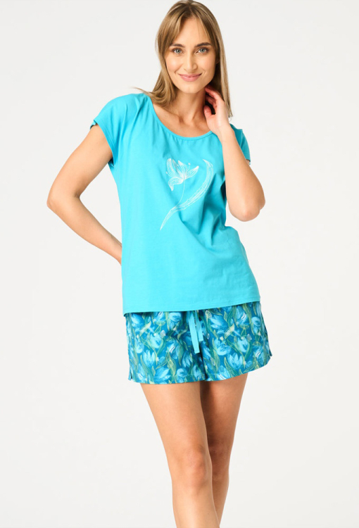 Яскрава жіноча піжама від польського бренду Key. Піжама виконана з якісної та м'якої бавовни, складається з футболки бірюзового кольору та синіх шортів з принтом у вигляді бірюзових тюльпанів. Футболка прямого силуету, з короткими рукавами та круглим вирізом горла, спереду прикрашена ніжним тюльпановим принтом. Шорти прямого крою, з м'якою гумкою в поясі, зручними бічними кишенями й невеликими бічними розрізами внизу. Піжама красива і дуже комфортна, ідеальна для розслаблюючих вечорів та радісних ранкових моментів, також може бути чудовим подарунком коханій та близькій людині.