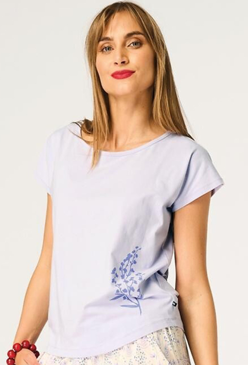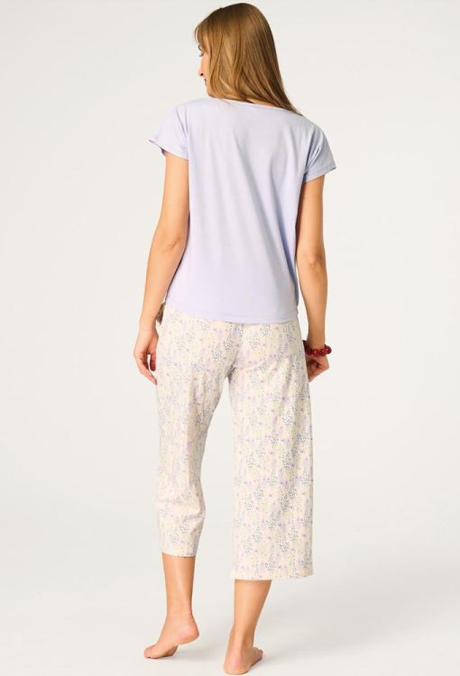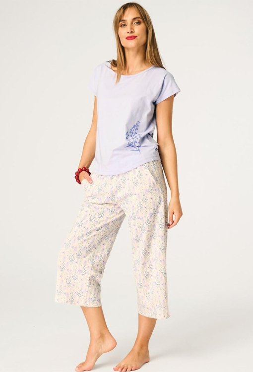 Літня жіноча піжама від польського бренду Key. Піжама виконана з якісної та м'якої бавовни, складається з футболки світло-фіолетового кольору, прямого силуету та кремових капрі з принтом у вигляді польових кольорів фіолетового кольору. Футболка з короткими рукавами та круглим вирізом горла, внизу зліва прикрашена ніжним принтом із польової квітки. Капрі вільного крою, з м'якою гумкою у поясі та зручними бічними кишенями. Піжама красива і дуже комфортна, ідеально підходить для теплих розслаблюючих вечорів вдома або спокійного нічного сну, також може бути корисним подарунком коханій та близькій людині.