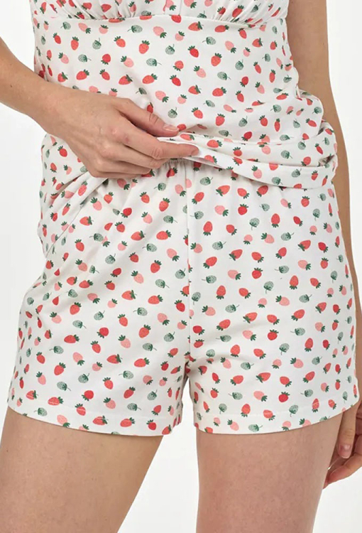 Яскрава жіноча піжама з колекції Lovely Berry від українського бренду Ellen. Піжама виконана з якісної та м'якої бавовни, кремового кольору з принтом із помаранчевих полуничок, складається з майки напівприлеглого силуету та шортів прямого крою. Майка з тонкими регульованими бретелями, підрізом під грудьми, V-подібним декольте із застібкою на три ґудзики. Лінія вирізу моделі прикрашена тонким кантом червоного кольору, бретелі виконані в тон оздоблення. Шорти зі зручною посадкою та м'якою гумкою в поясі. Піжама дуже красива і комфортна, може бути чудовим одягом для дому або корисним подарунком коханій та близькій людині.