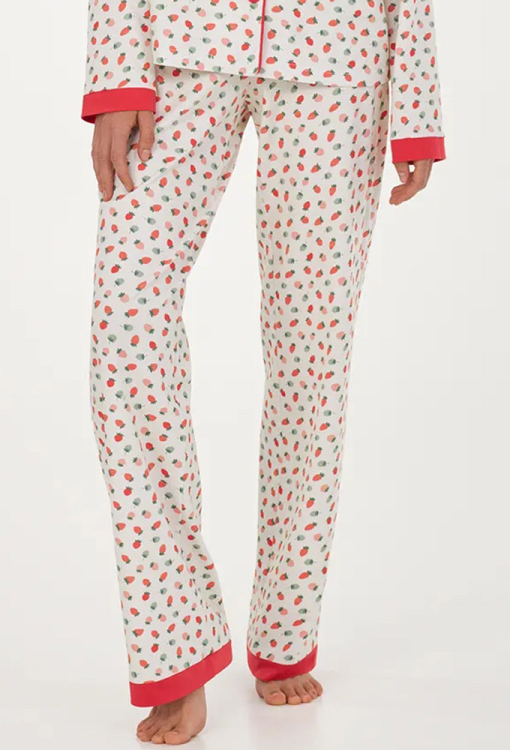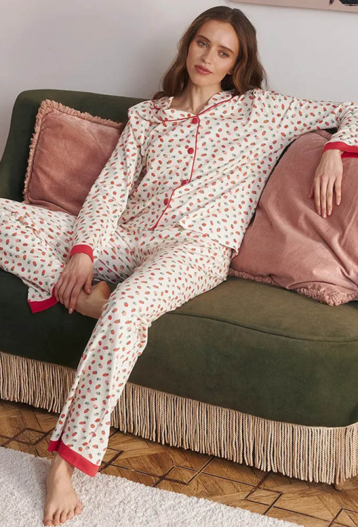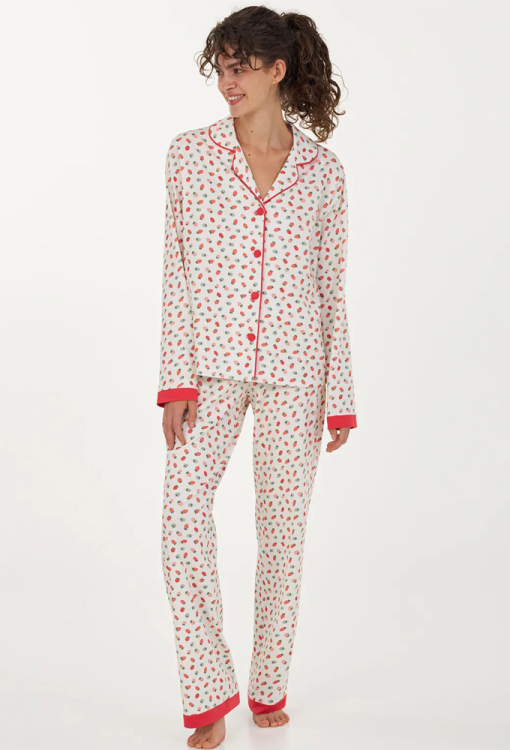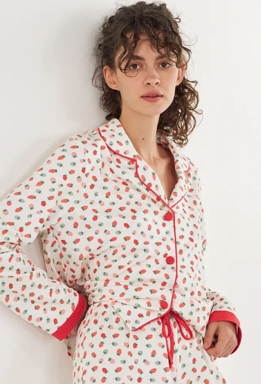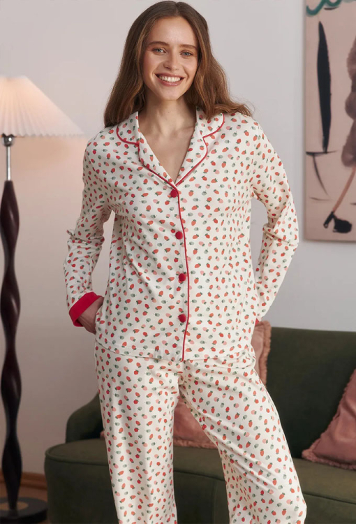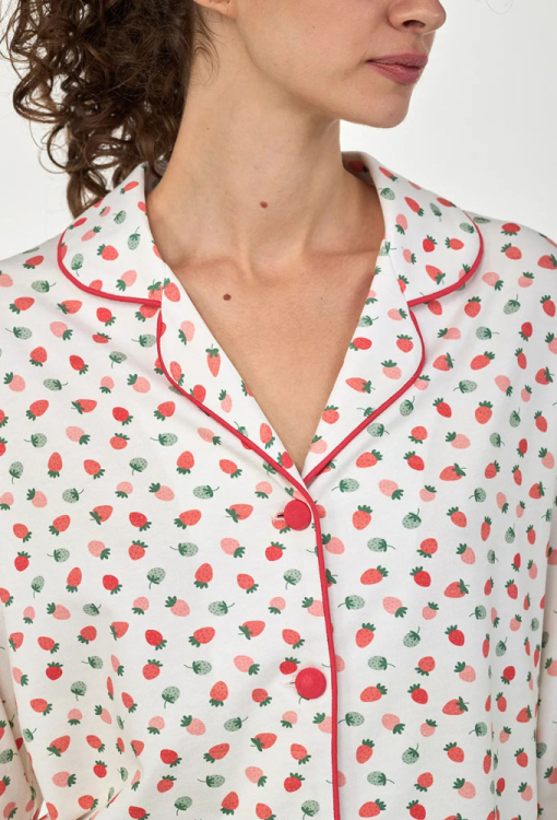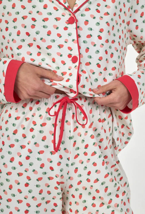 Яскрава жіноча піжама з колекції Lovely Berry від українського бренду Ellen. Піжама виконана з якісної та м'якої бавовни, кремового кольору з принтом із помаранчевих полуничок, складається з сорочки та штанів прямого силуету. Сорочка з довгими рукавами та відкладним коміром, застібається на ґудзики. Комір та полиці моделі оздоблені тонким кантом червоного кольору, рукави оброблені вільними червоними манжетами. Штани з м'якою гумкою у поясі та внутрішнім шнурком, внизу прикрашені вільними манжетами червоного кольору. Піжама дуже красива і комфортна, може бути чудовим одягом для дому або корисним подарунком коханій та близькій людині.