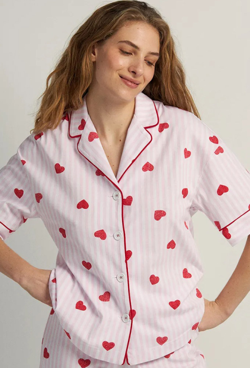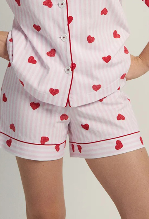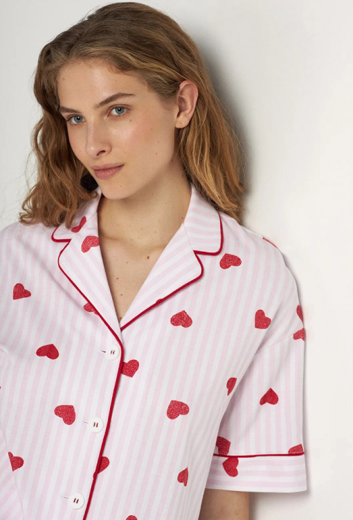 Романтична жіноча піжама з колекції Loveu від українського бренду Ellen. Піжама виконана з якісної та м'якої бавовни, ніжно-рожевого кольору в білу смужку та принт із червоних сердець, складається з сорочки із шортами прямого силуету. Сорочка з короткими рукавами та відкладним коміром, застібається на ґудзики, комір, полиці та рукави прикрашені тонким кантом червоного кольору. Шорти з м'якою гумкою в поясі та зручними бічними кишенями, внизу оброблені контрастним кантом. Піжама дуже красива і комфортна, також може бути чудовим одягом для дому або корисним подарунком коханій та близькій людині.