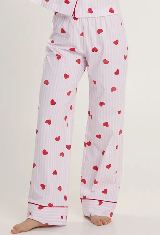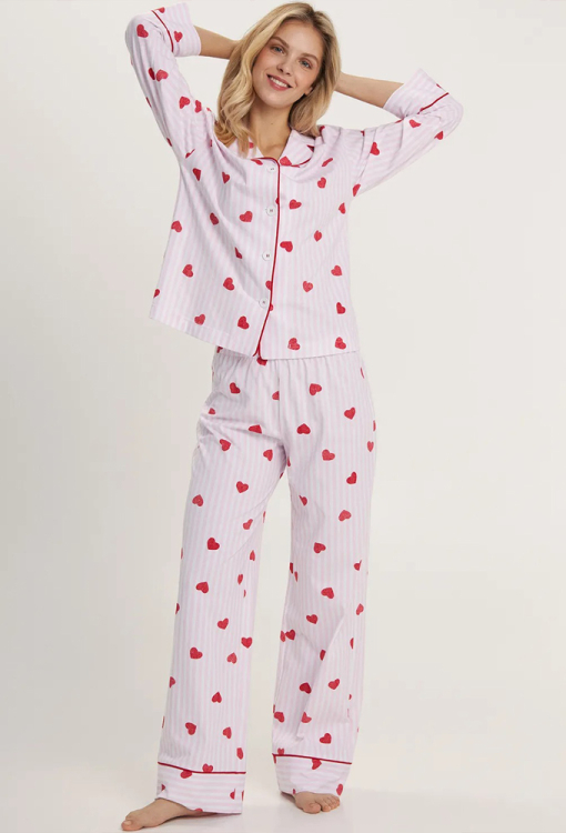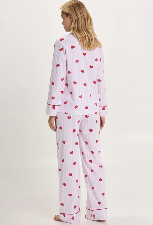 Романтична жіноча піжама з колекції Loveu від українського бренду Ellen. Піжама виконана з якісної та м'якої бавовни, ніжно-рожевого кольору в білу смужку та принт з червоних сердець, складається з сорочки зі штанами прямого силуету. Сорочка з довгими рукавами та відкладним коміром, застібається на ґудзики, комір, полиці та рукави прикрашені тонким кантом червоного кольору. Штани з м'якою гумкою у поясі, внизу оброблені контрастним кантом. Піжама дуже красива і комфортна, також може бути чудовим одягом для дому або корисним подарунком коханій та близькій людині.