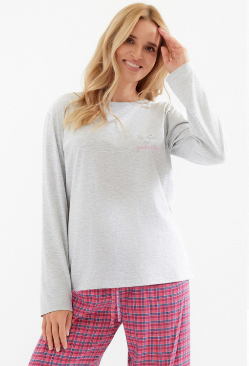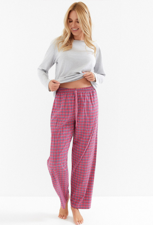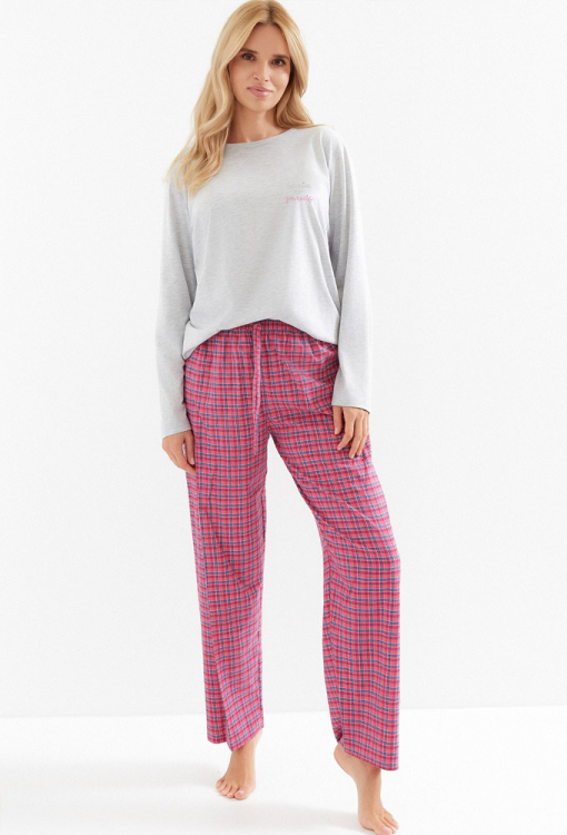 Стильна жіноча піжама Madlen від польського бренду Taro. Піжама виконана з якісної та м'якої бавовни, складається з кофти сірого меланжевого кольору та рожевих штанів у синій картатий принт. Кофта з довгими рукавами та круглим вирізом горла, вгорі зліва прикрашена ніжним принтом із напису. Штани вільного крою, зі зручною посадкою та м'якою гумкою в поясі, регулюються по ширині за допомогою внутрішнього шнурка. Піжама дуже красива і комфортна, ідеальна як для прохолодних ночей, так і для затишних домашніх вечорів, а також може бути чудовим подарунком коханій або близькій людині.