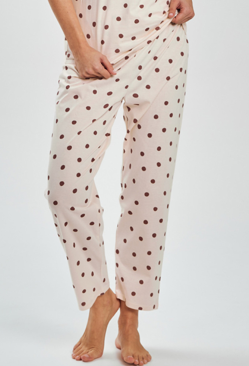 Чарівна жіноча піжама Nita від польського бренду Taro. Піжама виконана з якісної та м'якої бавовни кремового кольору в коричневий горошок, складається з футболки та штанів прямого силуету. Футболка з короткими рукавами та круглим вирізом горла, штани зі зручною посадкою та м'якою гумкою в поясі. Піжама дуже красива та комфортна, ідеальна для літніх теплих ночей та домашнього відпочинку, а також може бути чудовим подарунком коханій чи близькій людині.