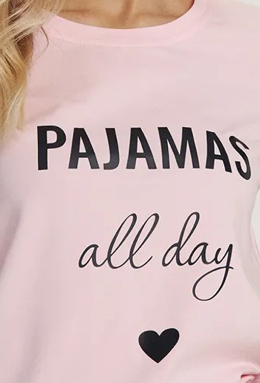 Стильна жіноча піжама з колекції Pajamas від українського бренду Ellen. Піжама виконана з якісної та м'якої бавовни, складається з футболки рожевого кольору та коротких шортів у картатий принт рожевого та чорного кольору. Футболка прямого силуету, з короткими рукавами та круглим вирізом горла, спереду прикрашена принтом з напису "Pajamas all day" та серця чорного кольору. Шорти також прямого крою та з м'якою гумкою в поясі. Піжама дуже красива і комфортна, може бути чудовим одягом для дому або корисним подарунком коханій та близькій людині.